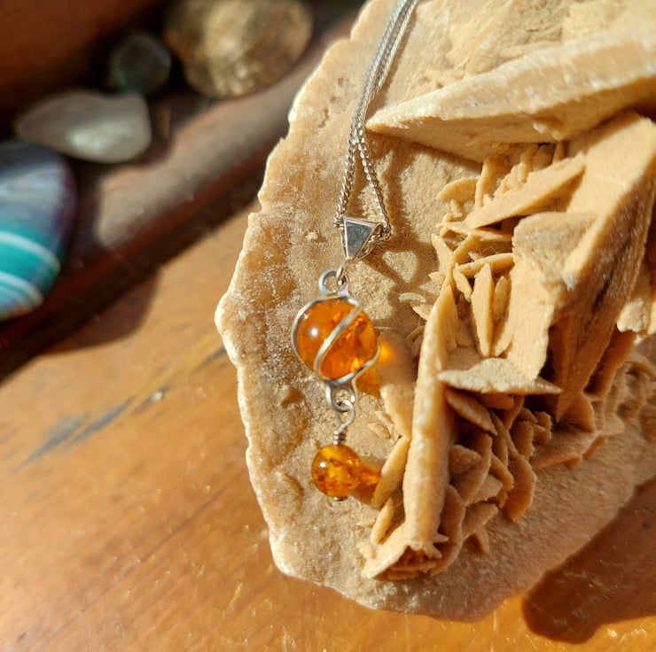 This bead of cognac Baltic has a sterling silver wire swirling around it and a smaller bead under it. It dangles 3cm from a sterling silver chain, which comes in a choice of 16,18 or 20 inches in length. The matching earrings dangle 2.3cm from a sterling silver lever-back hook so that it can't come out and get lost.