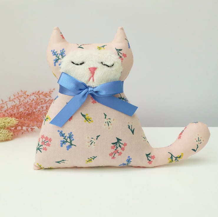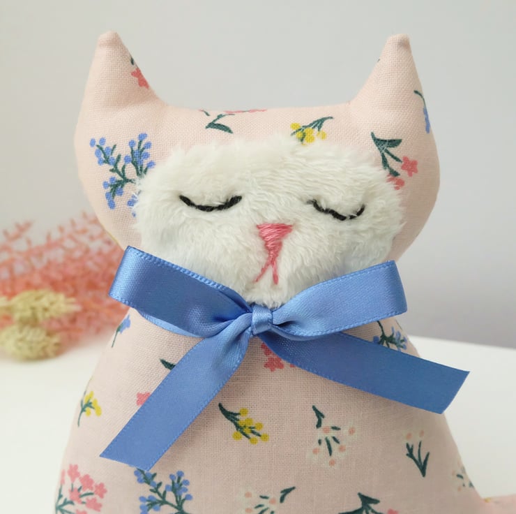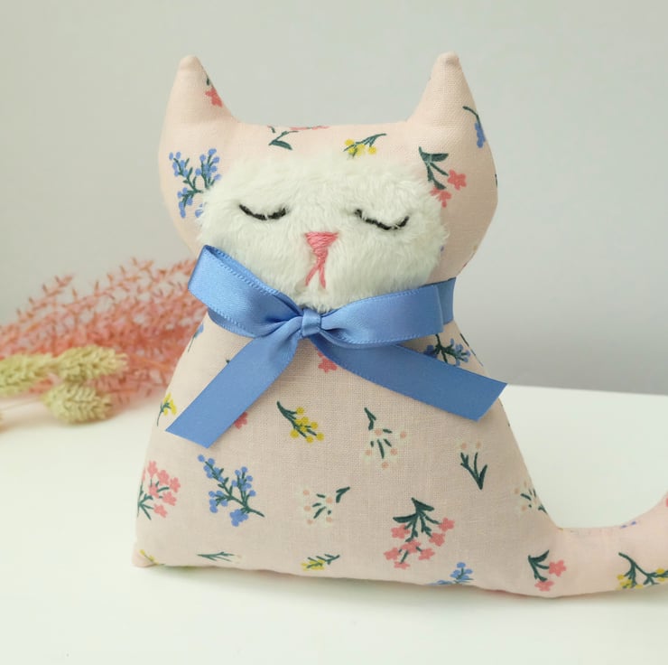 The cat is filled with scoops of fresh organic lavender and toy stuffing for a firm shape. The scent lasts a long time and you only need to squeeze the cat to release the scent, or you can add lavender drops too. I've hand sewn a soft ivory plush fabric face and stitched eyes in black and a nose in pink embroidery thread, then added a mid blue satin ribbon bow around the cat's neck.