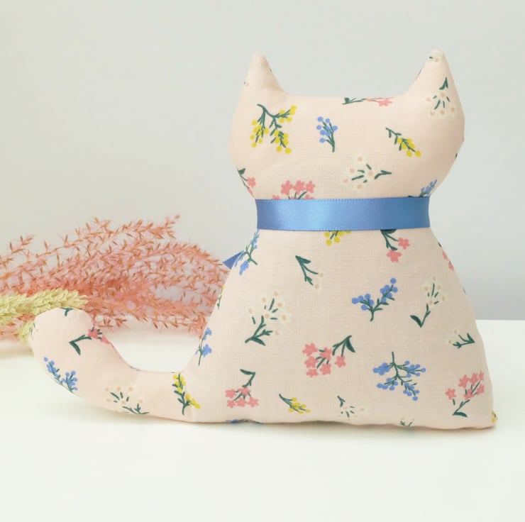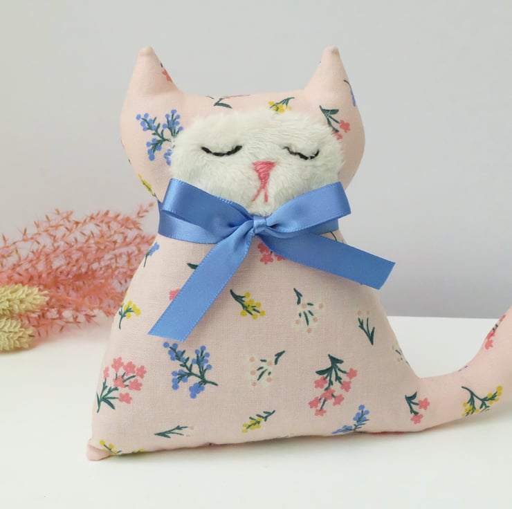 This lavender sachet cat is made using a vintage style, pretty pink floral sprig fabric, with flowers in pink, blue, yellow and white, with green stems. Place the cat into bedroom drawers to sweetly scent clothes, or sit it on a pillow to help you have a restful night's sleep.