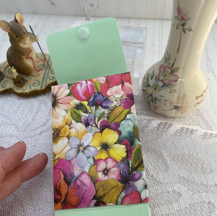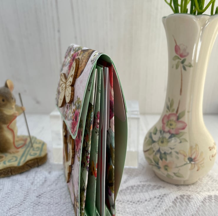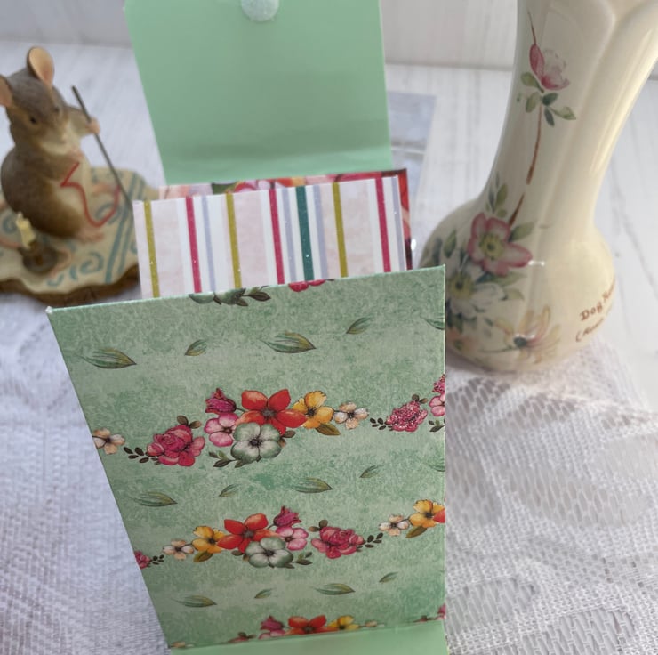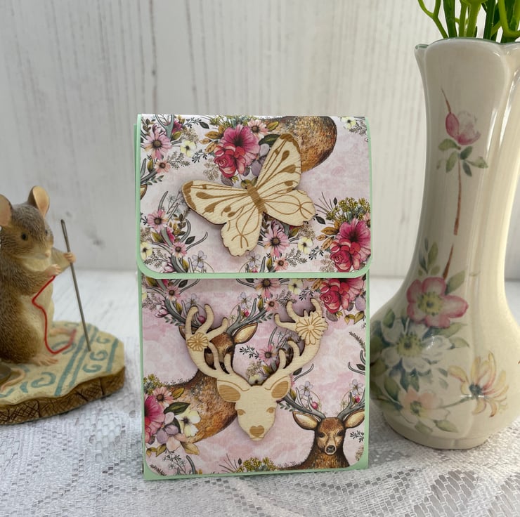 Pretty papers from a Bohemian collection, made into 4 mini envelopes in a concertina folder, cover green with a boho deer and flowers design, embellished with a wood butterfly and deer ephemera. Closure a sticky loop dot.