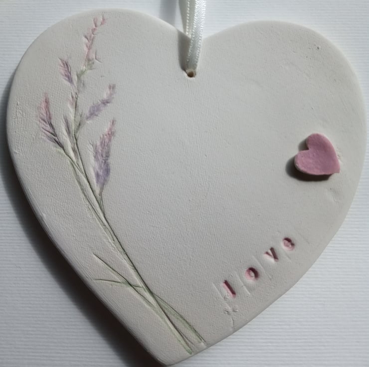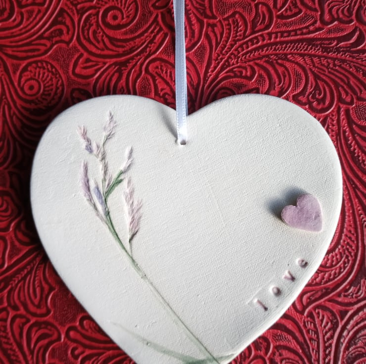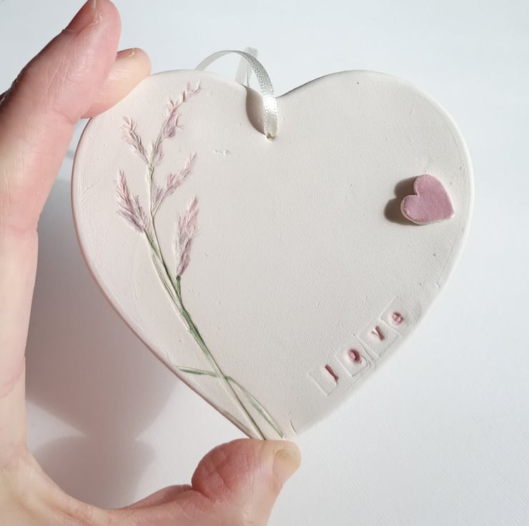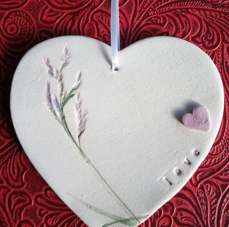 This is a lovely ceramic heart, with a flower imprinted and the word "love" stamped into the clay. It also has a small raised heart on it. It has been glazed using the natural shape of the plant, with the white clay being untouched to give it, its rustic, earthly quality.