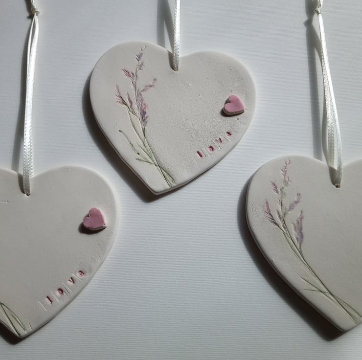 I've recently been making little birds on round bases, imprinted with grass seeds or flowers and I realised how cute they were, as little ceramic pieces and would look lovely as a heart shape hanging.