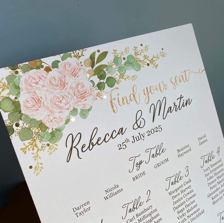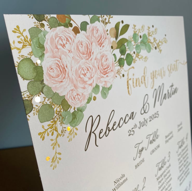 Personalised WEDDING table seating plan A3 size, blush pink/ivory roses and green Eucalyptus leaves rustic wedding theme design.