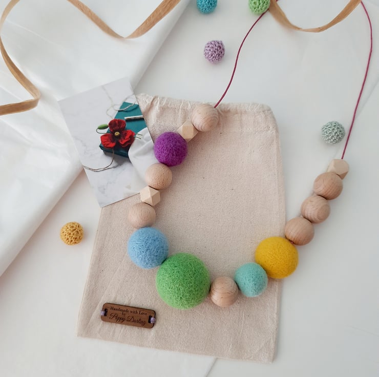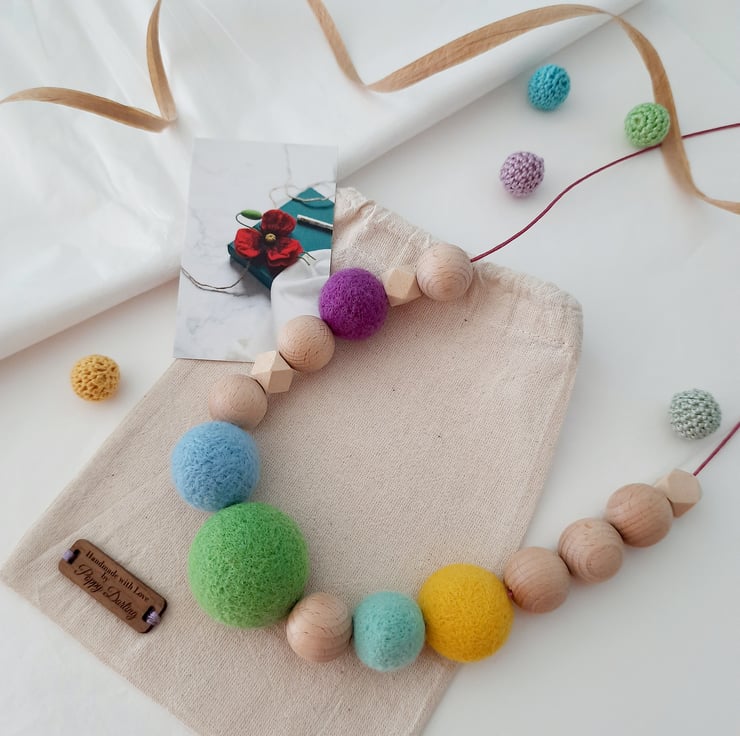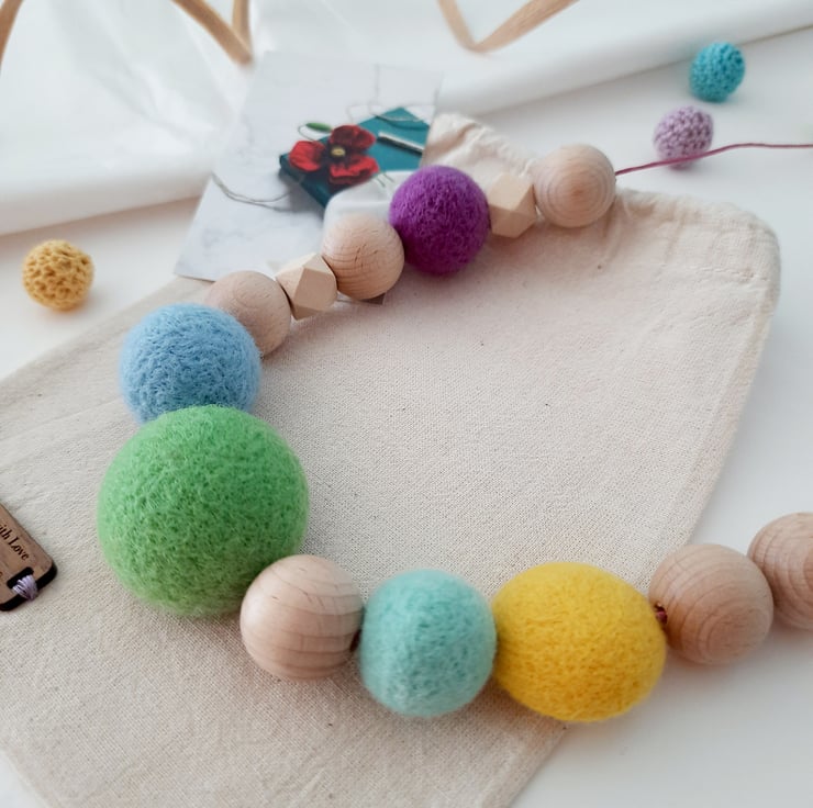 A one off individual, tactile, lightweight piece- each wool roving shape has been crafted by needle felting wool roving into various shapes and sizes, strung onto a soft cotton cord.
