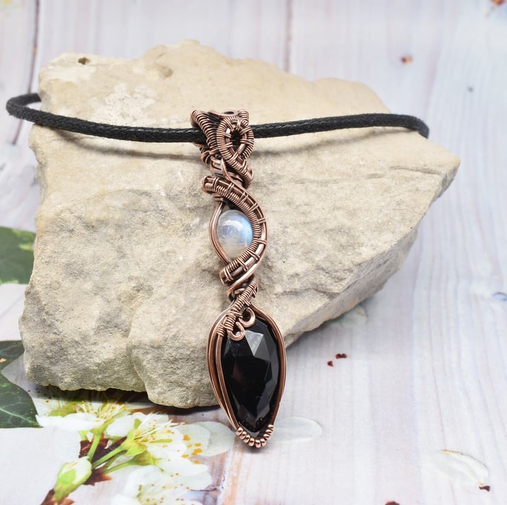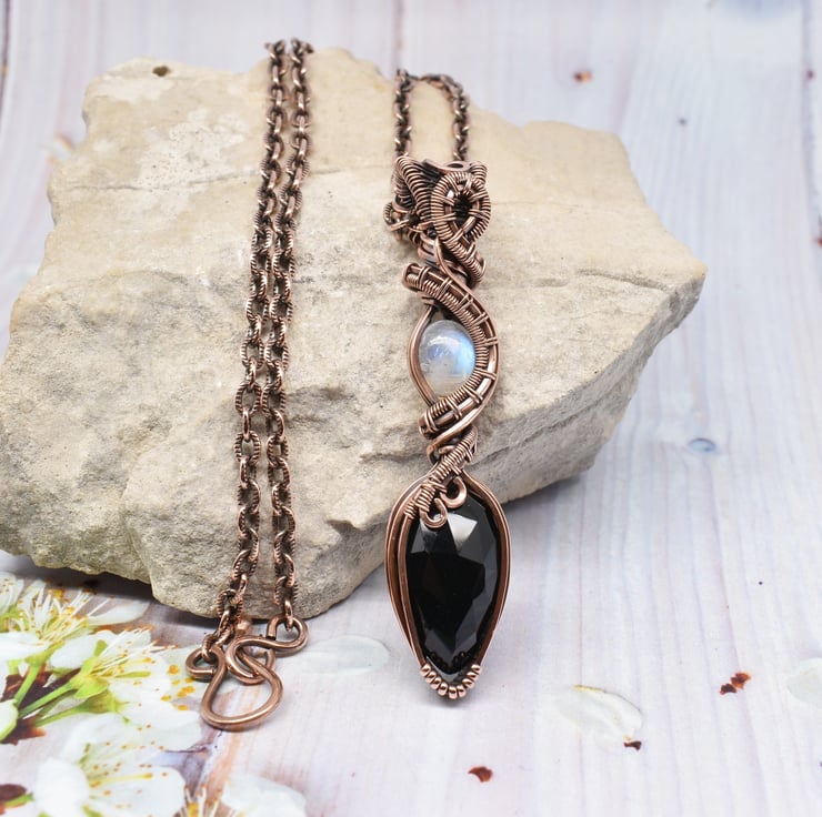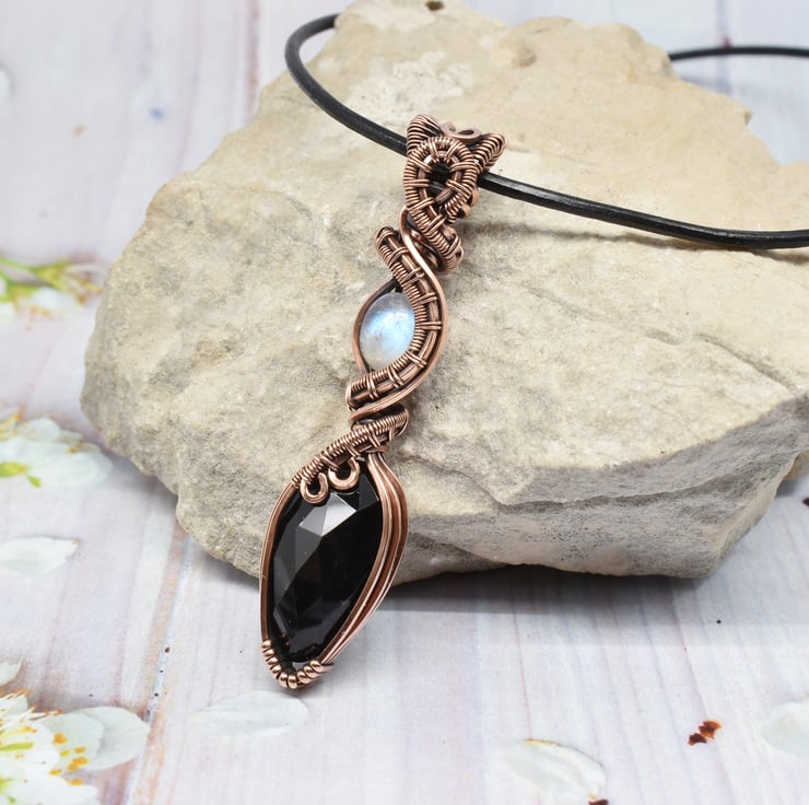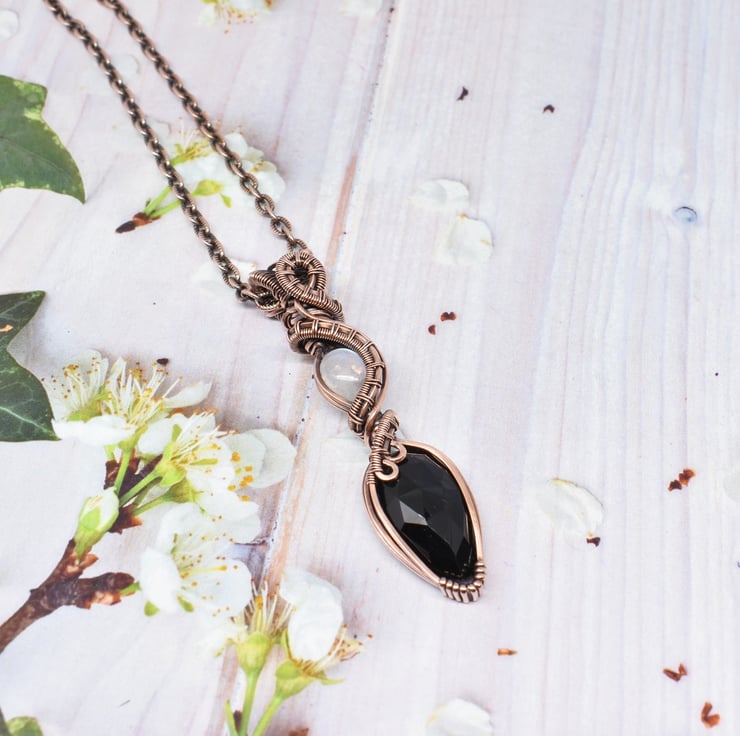 I used solid copper wire to wrap and weave around this beautiful faceted black onyx, added a dainty rainbow moonstone above it then completed the pendant with a woven bail.