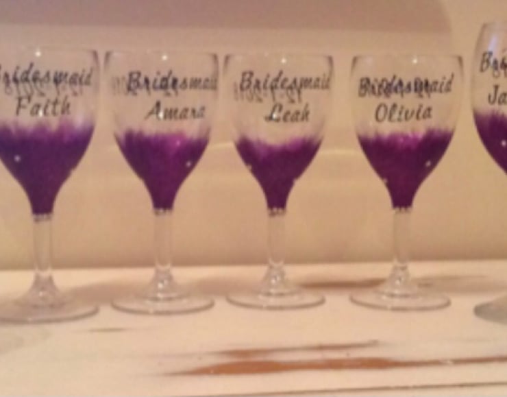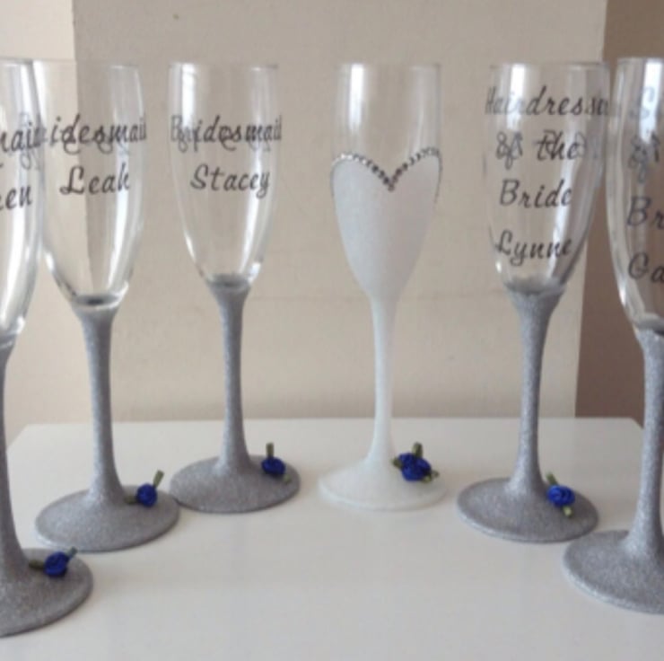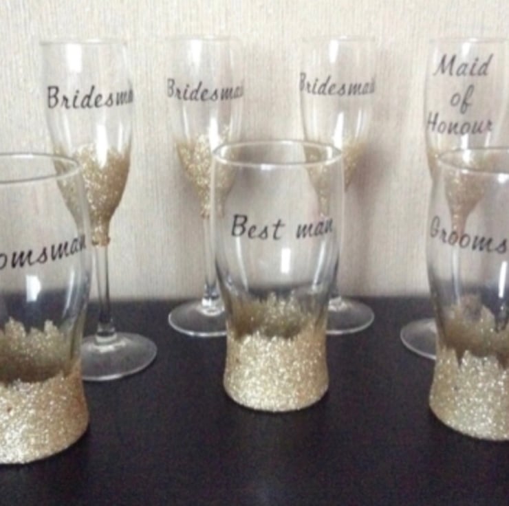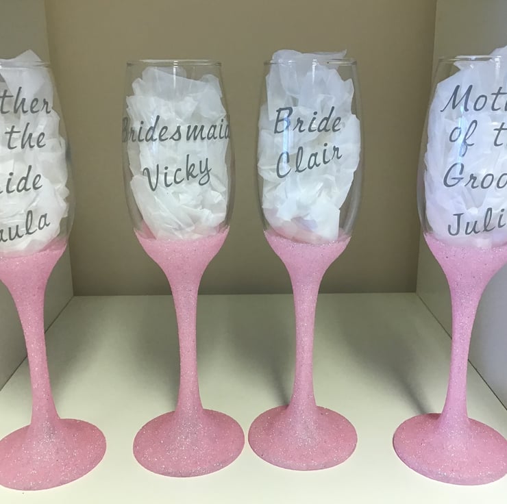 Personalised Wedding Glasses, glittered in one of the colour choices below with Bride, Groom, Bridesmaid etc on one side and wedding date on the other. Names can also be added.