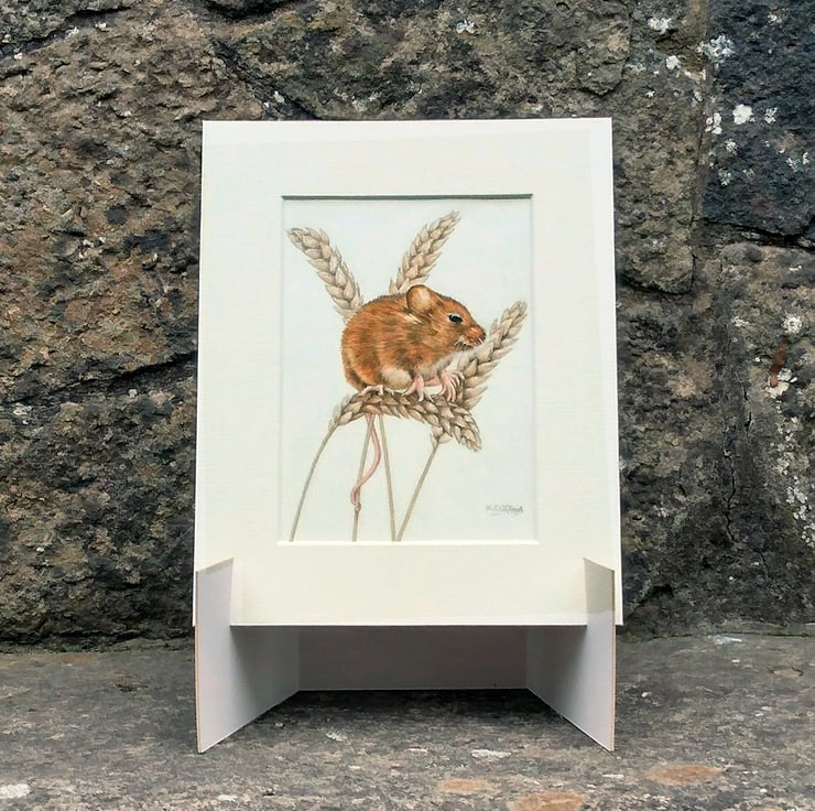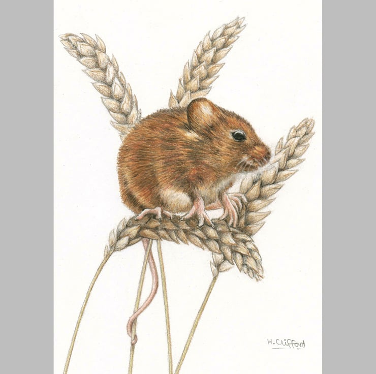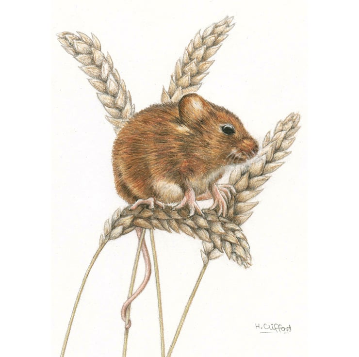 This is a unique original colour pencil drawing of a cute little harvest mouse sitting among some stalks of corn. He has soft golden brown fur, little pink paws, and his long tail is curling round one of the stems to keep him safe. His bright beady black eyes have just caught sight of us, and any moment now he will dart away!
