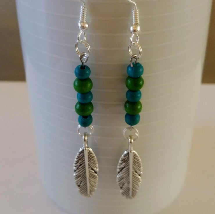 Small green and blue wood beads light weight. Featuring a metal silver leaf charm.