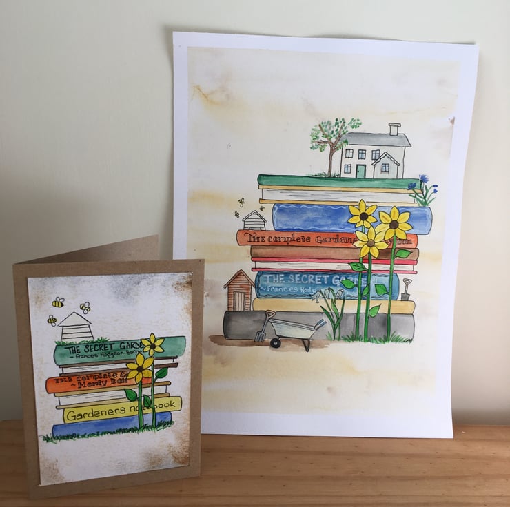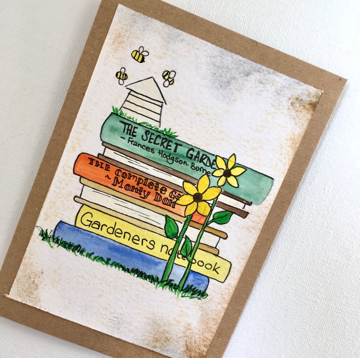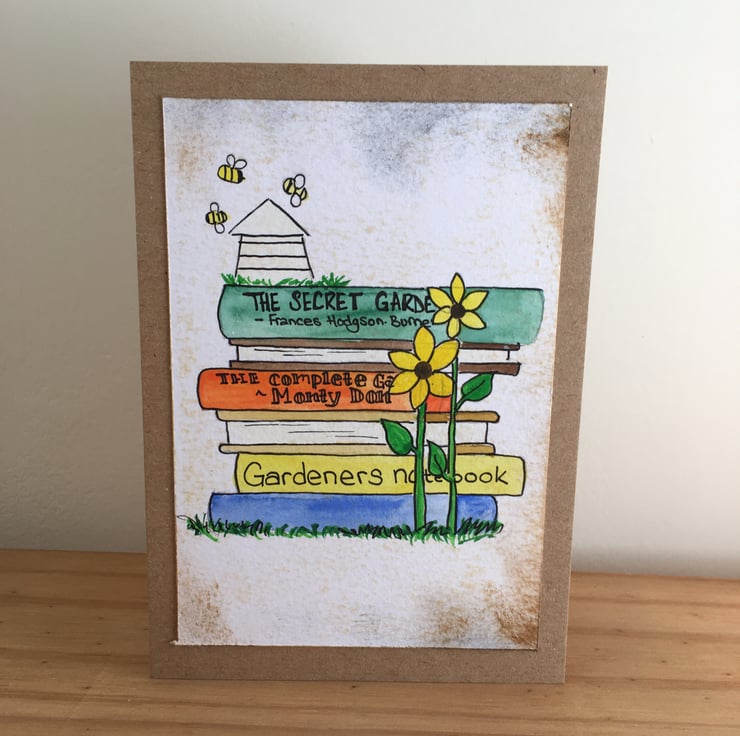 Made using a recycled card blank in a natural colour, I have attached an original illustration of a stack of books with a garden theme. There are hints of the garden dotted all over the stack, including sunflowers and a beehive. The illustration is painted using watercolours and ink and is completely unique.