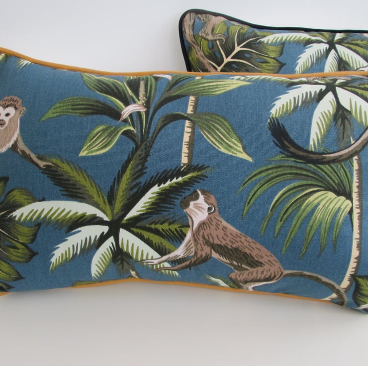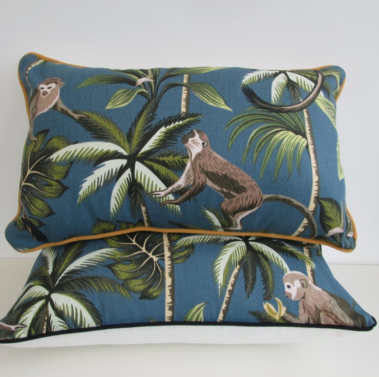 Monkeys fabric cushion cover with cream back and central zip and black piping.
