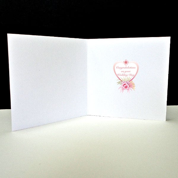 Inside this card is a pretty heart shape with a delicate spray of tropical flowers and leaves, which is hand-cut and mounted in relief reading Congratulations on your Wedding Day.