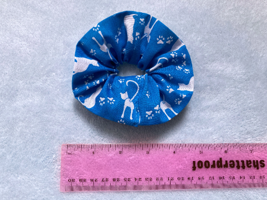 Large blue scrunchy with cat pattern.