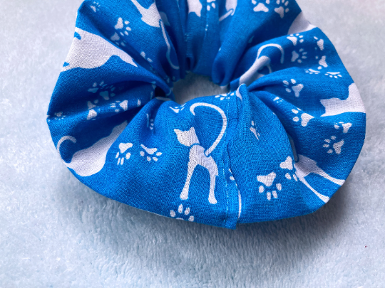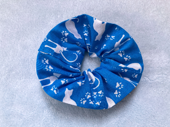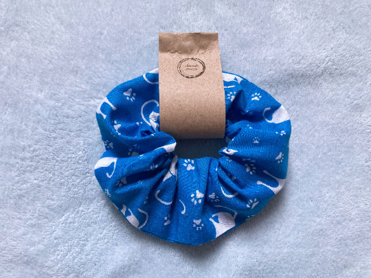 Large, handmade cotton scrunchy in blue, patterned with white cats and paw prints. These fun friends make the perfect summer accessory.