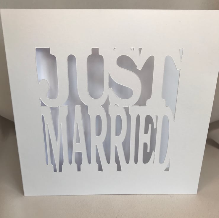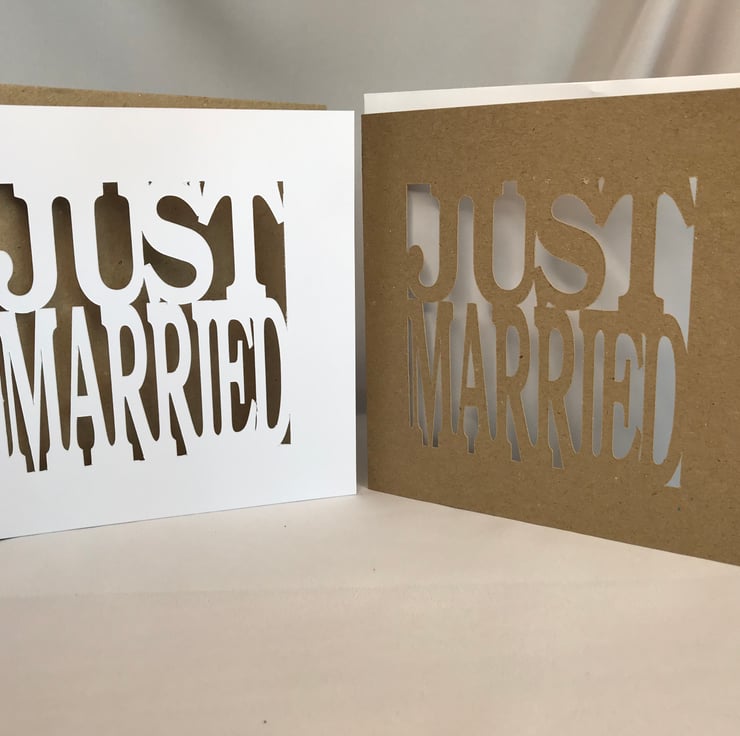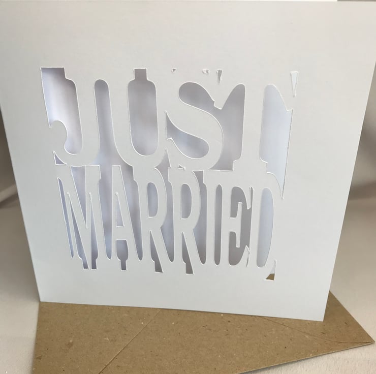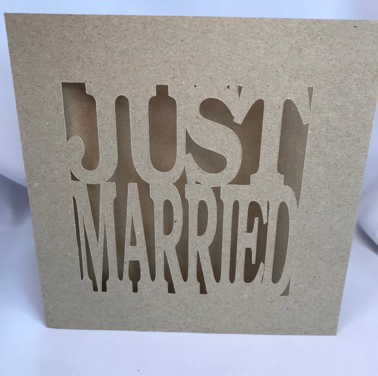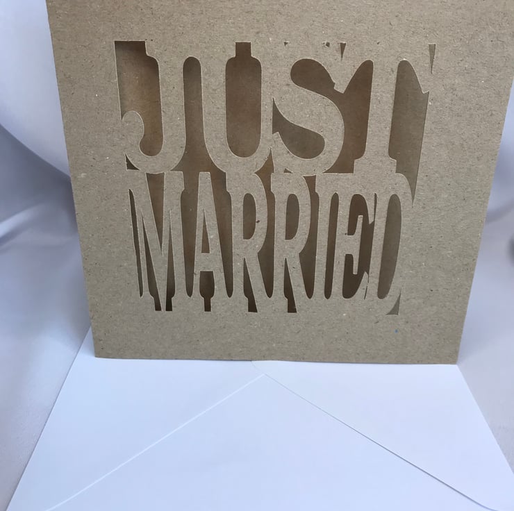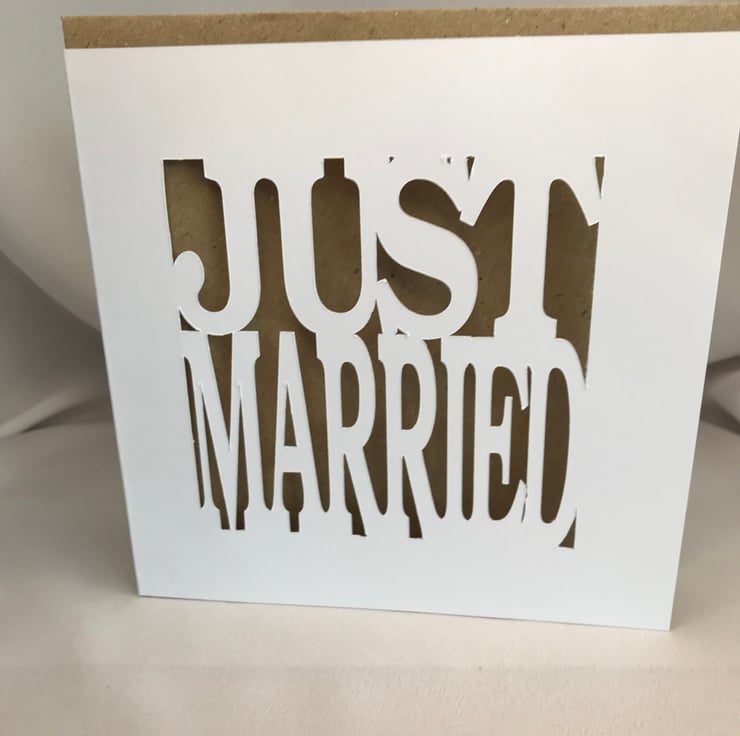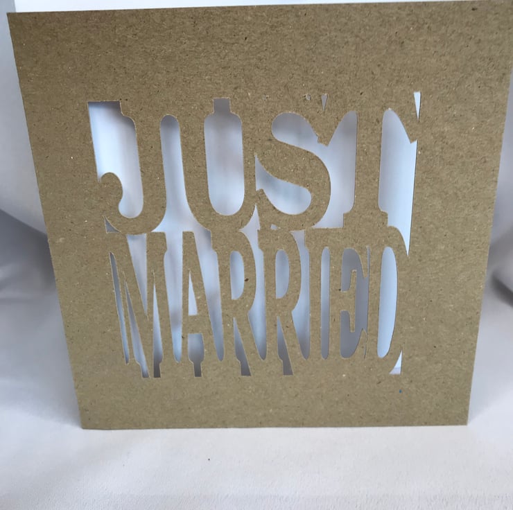 The card has Just Married cut out on the front of the card with a blank inside to write your loving message. On the back of the card is a sticker saying handmade and designed by Kind Crafts.