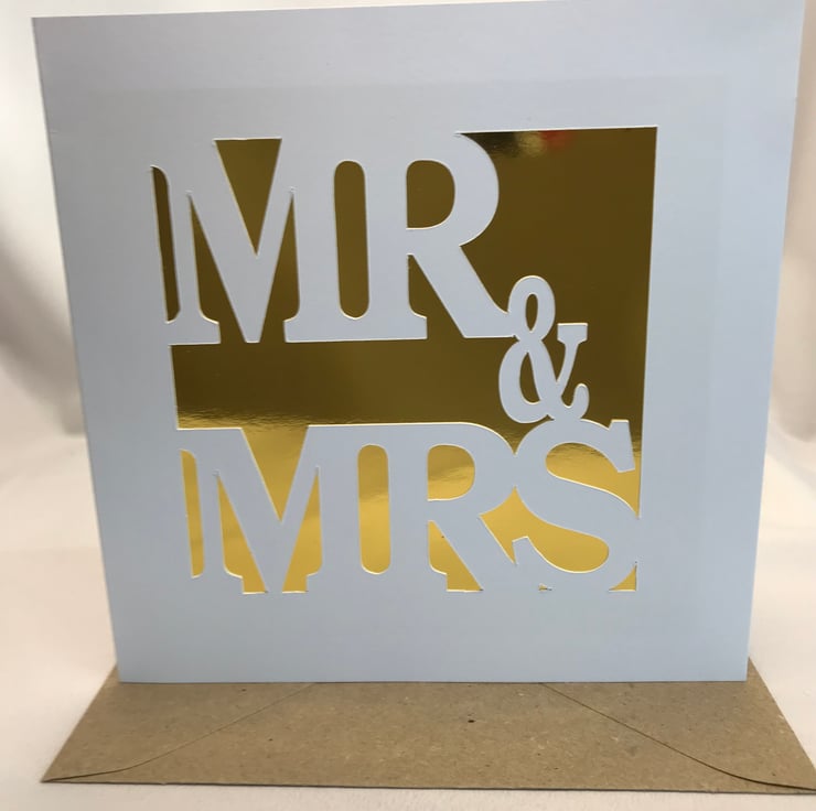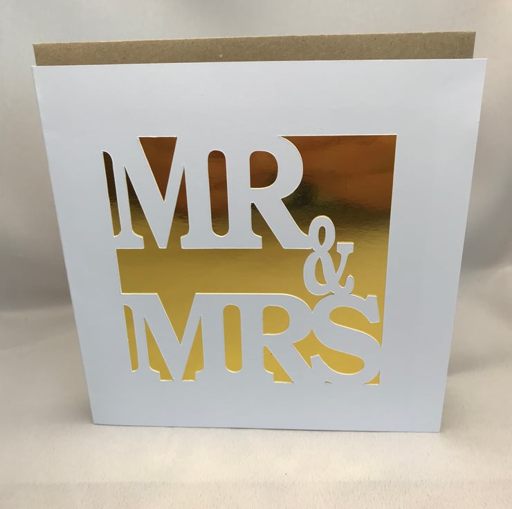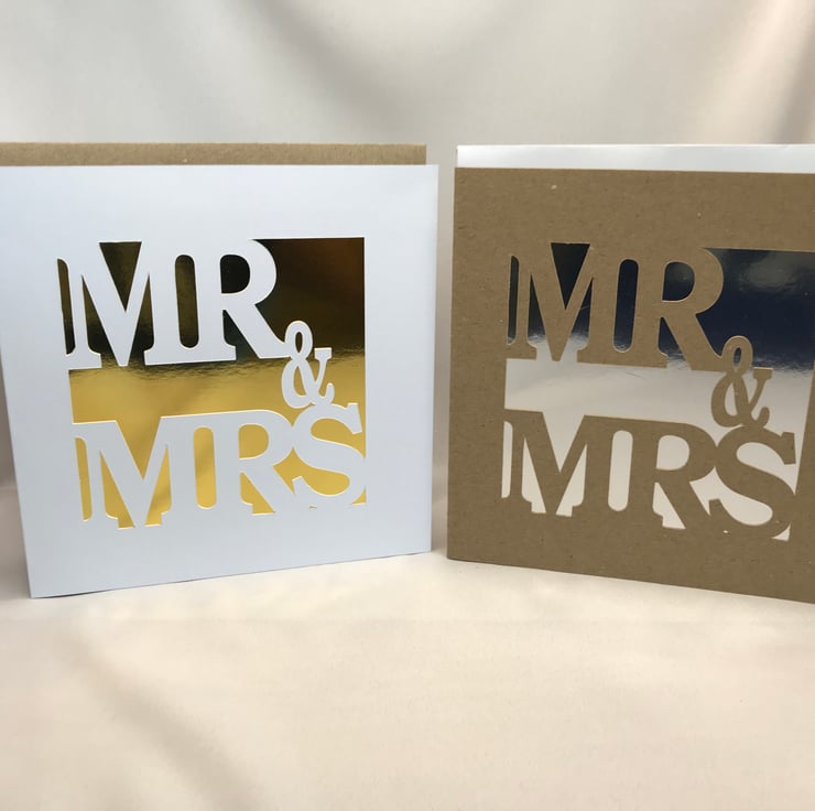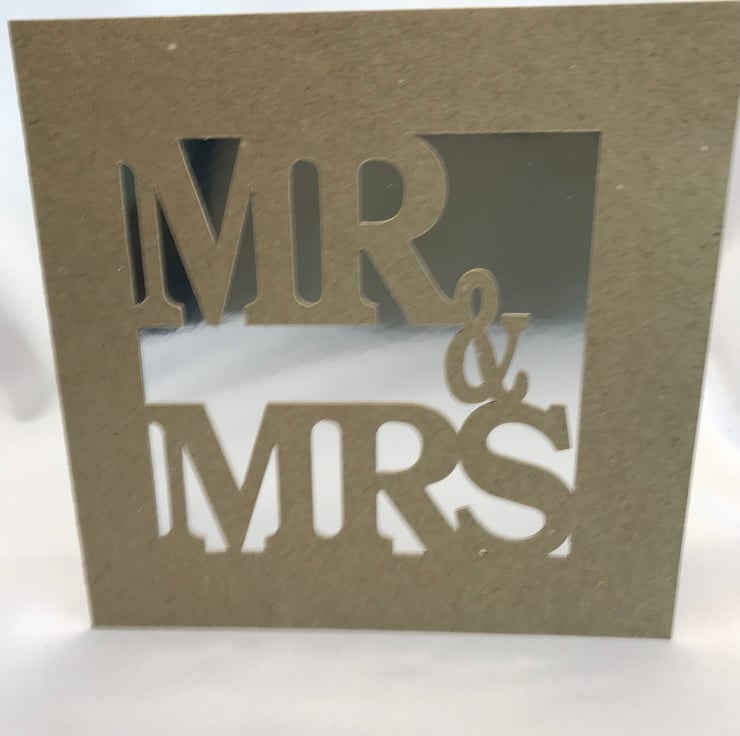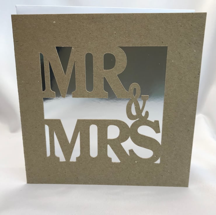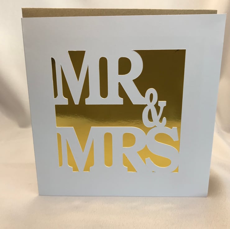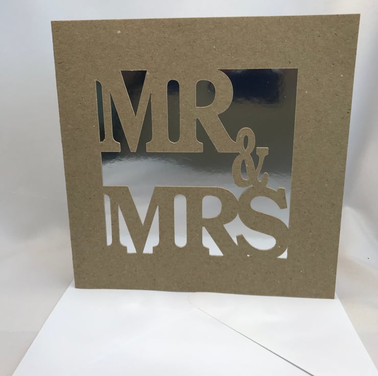The card has MR & MRS cut out on the front of the card with a blank inside to write your loving message. On the back of the card is a sticker saying handmade and designed by Kind Crafts.