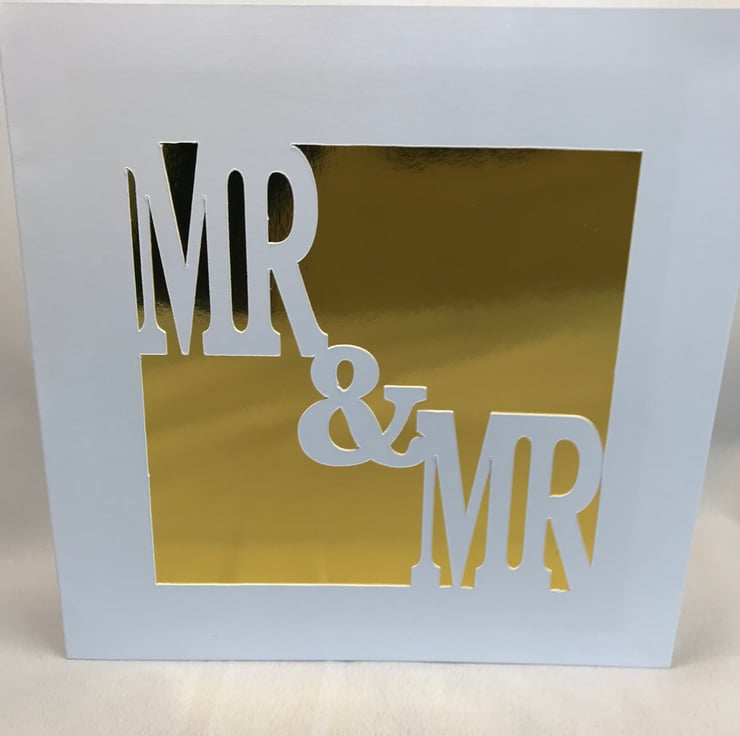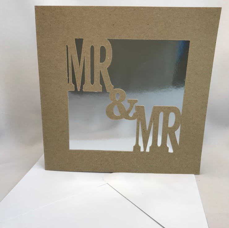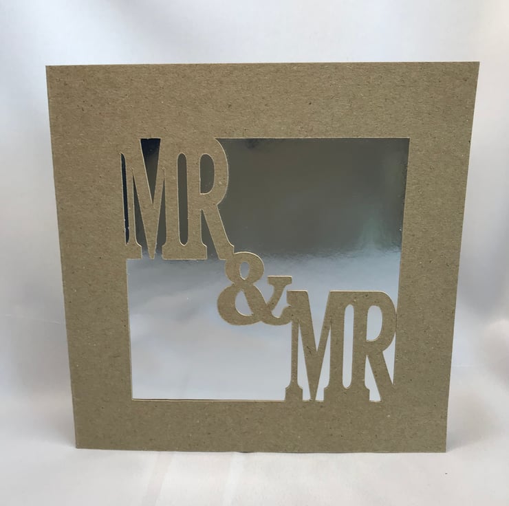 The card has MR & MR cut out on the front of the card with a blank inside to write your loving message. On the back of the card is a sticker saying handmade and designed by Kind Crafts.