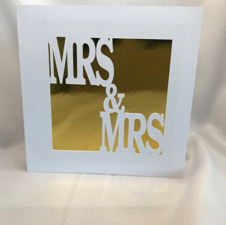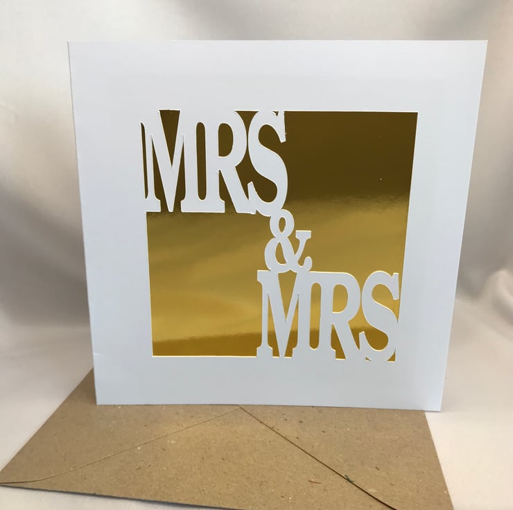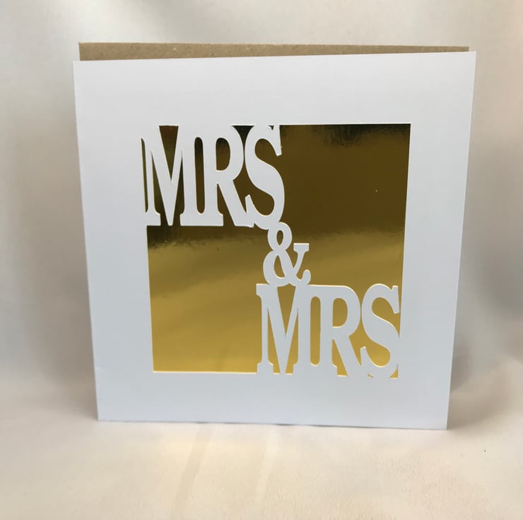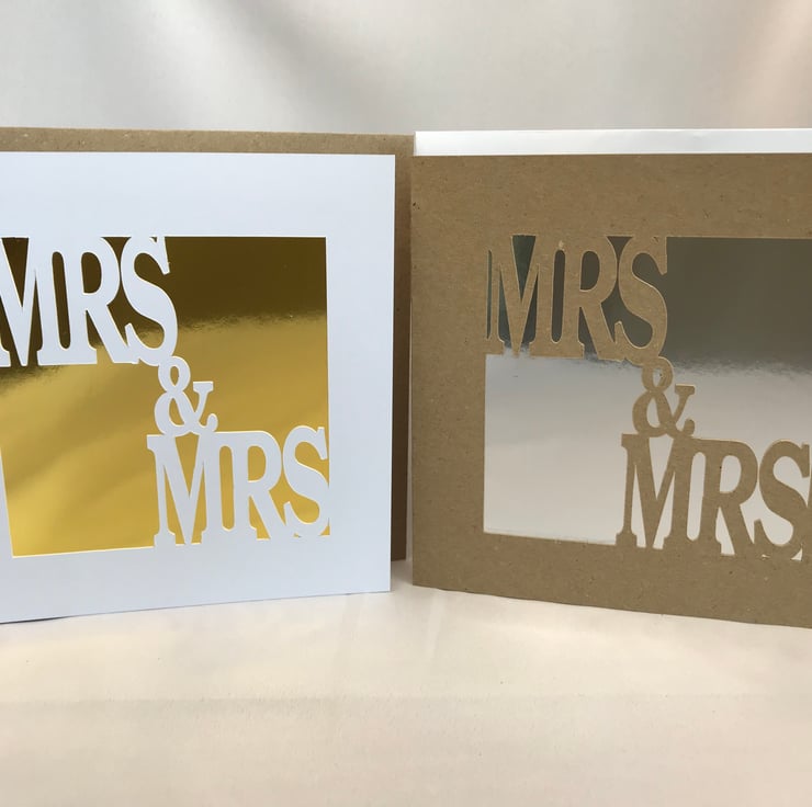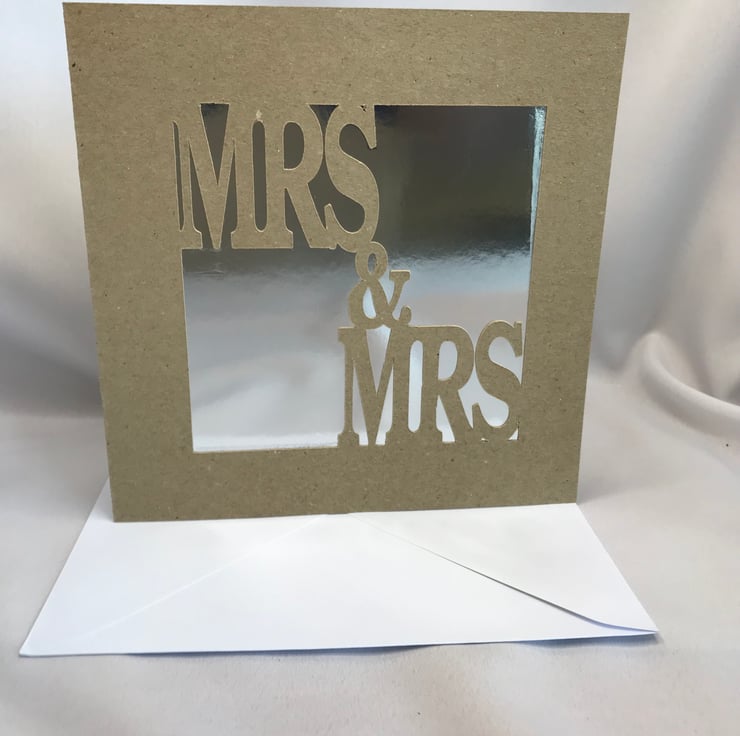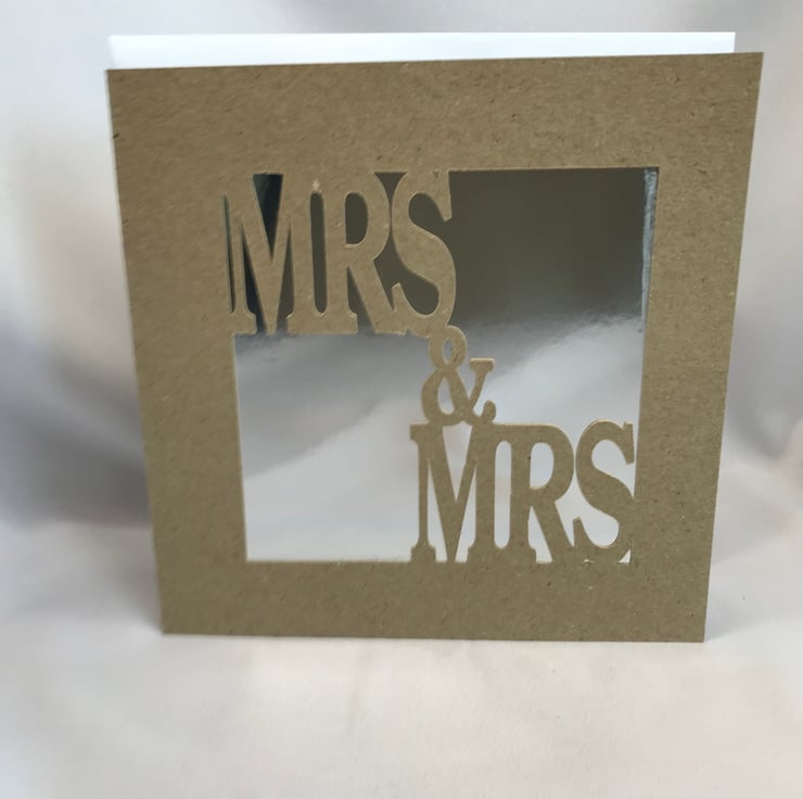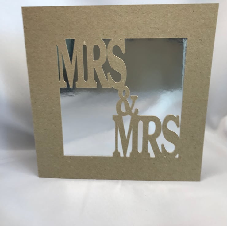 The card has MRS & MRS cut out on the front of the card with a blank inside to write your loving message. On the back of the card is a sticker saying handmade and designed by Kind Crafts.