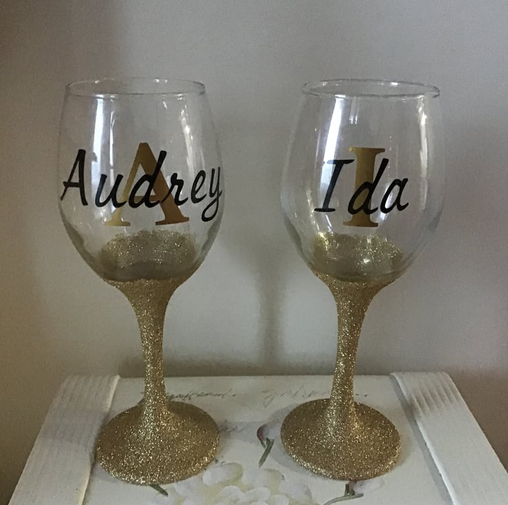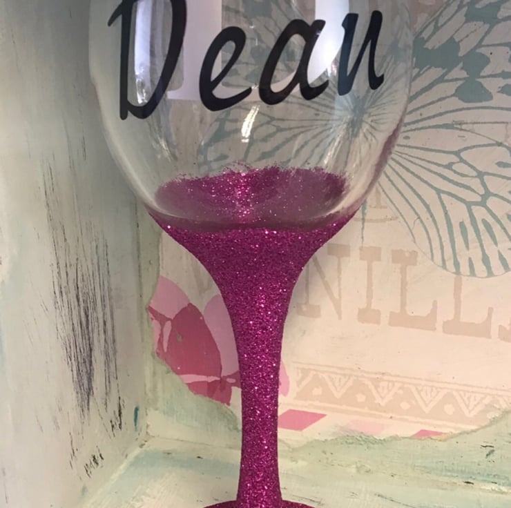 Wine glass, glittered in one of the colour choices below with and initial and name added (£6.99 per glass).