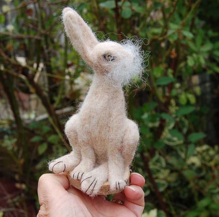 The wool fibre has been jabbed many times to create the shape of the hare. A top coat of light brown multi toned sheep fibre has been added. Fine details have been sewn with cotton.