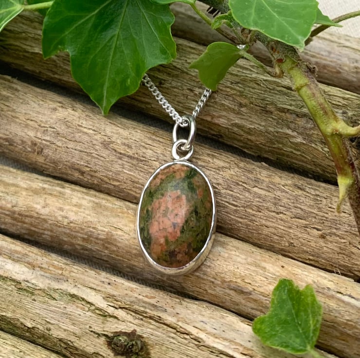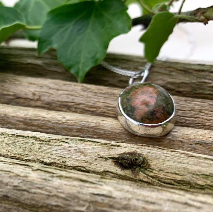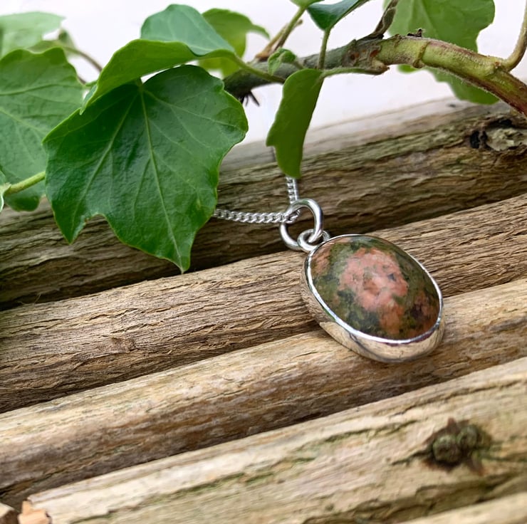 This is a mossy green and pinkish piece of unakite that reminds me of walking through a forest on a cool day, the moss and lichen on trees, the silver shine of a brook and the song of far off birds. It really is like carrying a little piece of a forest with you, and if you turn it over you’ll see a secret reminder of nature that’s just for you.
