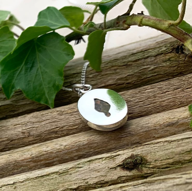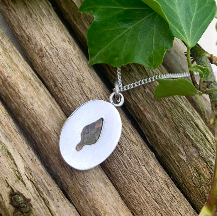 The stone is approximately 18mm x 13mm and set in a fine silver bezel, finished with a sterling silver backing plate and fittings.