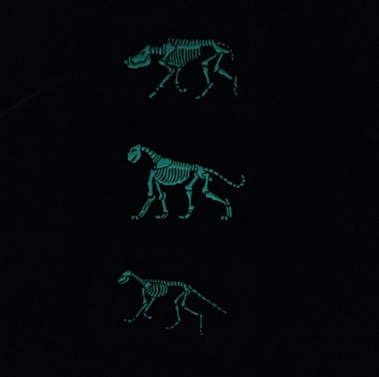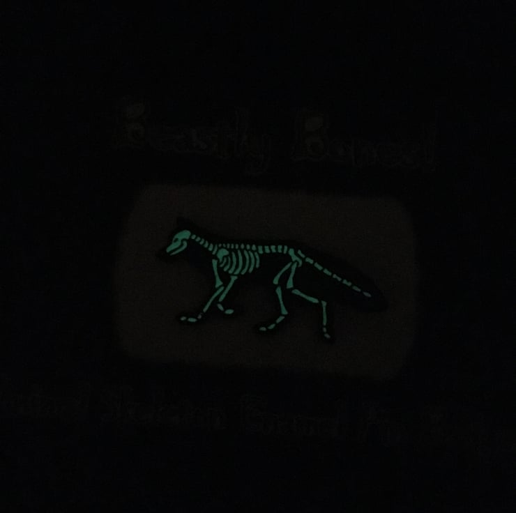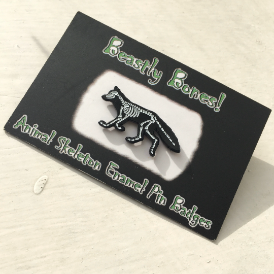 X-Ray Fox Skeletons feature on these soft enamel pin badges, made in black nickel-free plated metal with a glow in the dark white fill for the bones!