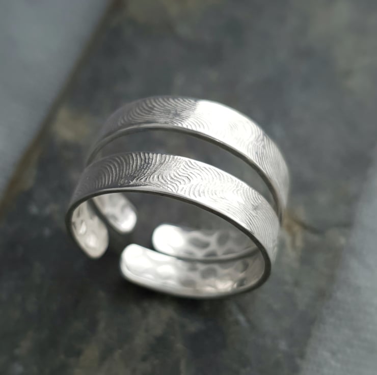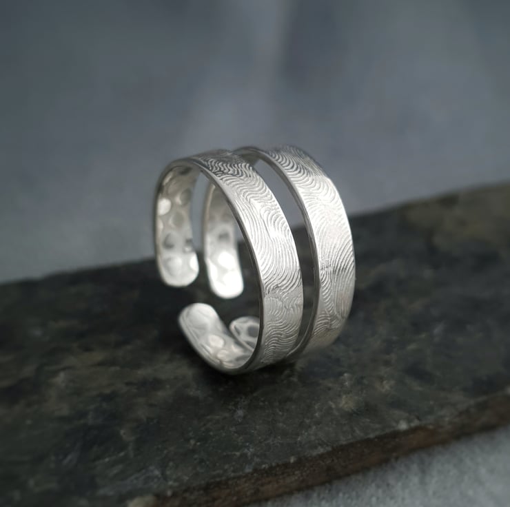 These two adjustable size Balance Me Earth & Water stacking rings have been handmade in textured sterling silver (recycled). The two different patterns decorating each ring represent two spiritual elements. Hidden within is the Earth texture while the outside pattern symbolises Water. The ring stack, and its Water and Earth design, is supposed to bring balance between constancy and change, stillness and movement in everyday life.