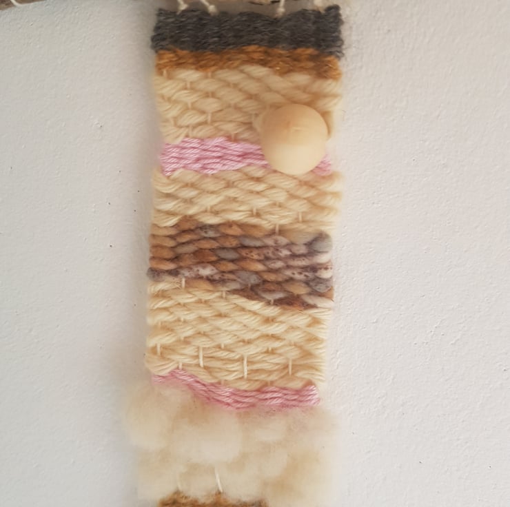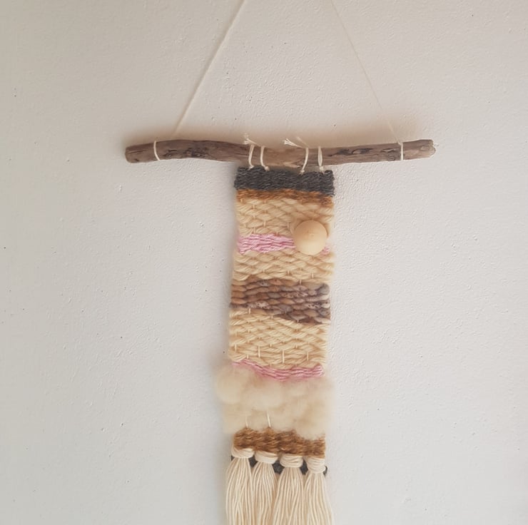 Dimensions: height 46 cm (including driftwood and hanging yarn), width 6.8-9.5cm actual tapestry, 21.4cm driftwood width.