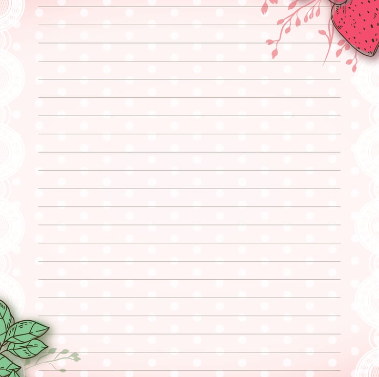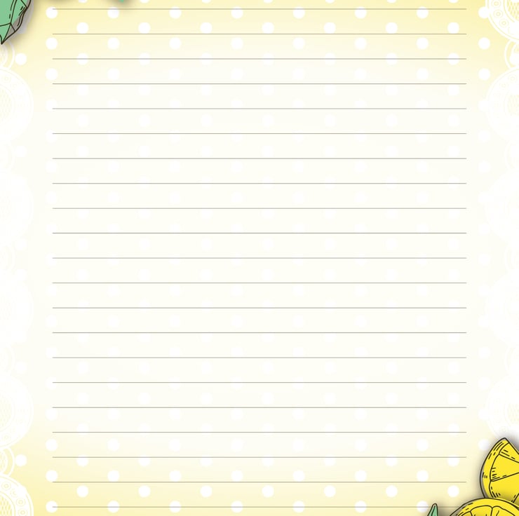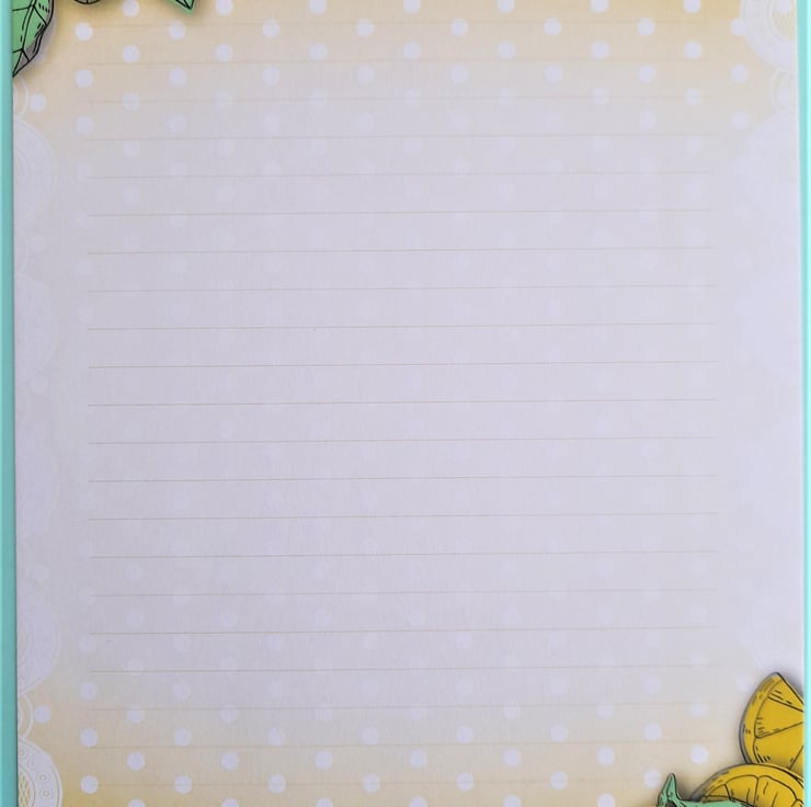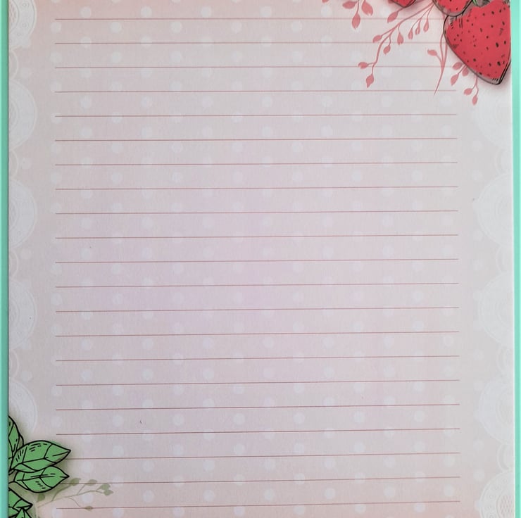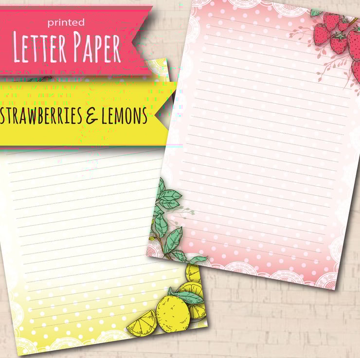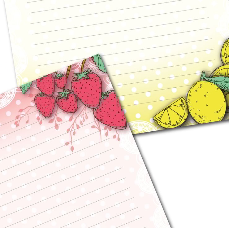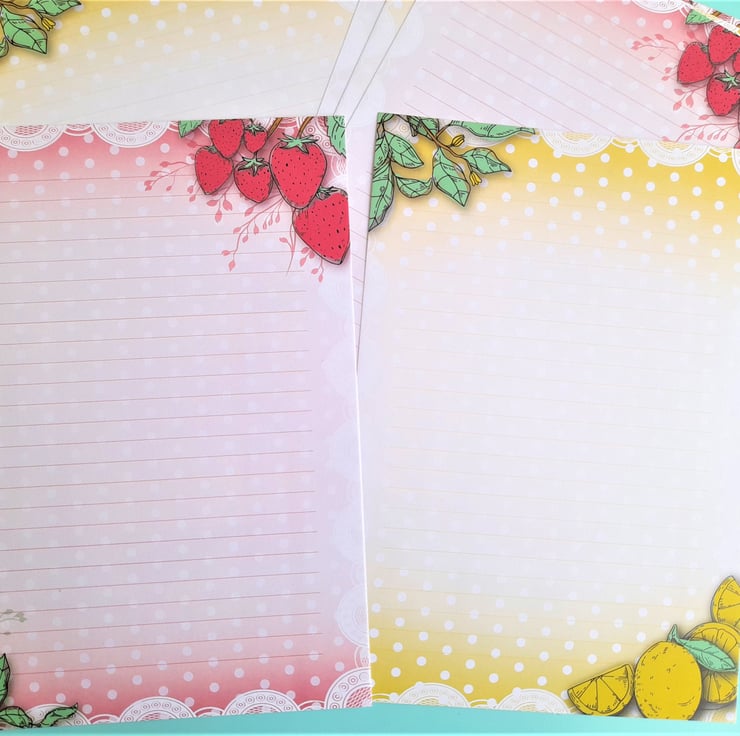 The paper has feint 7mm rules / lines, printed up to the edge in full colour on one side onto 100gsm white paper. There are two designs in the pack: strawberries and lemons - you will receive 5 sheets of strawberries and 5 sheets of lemons.