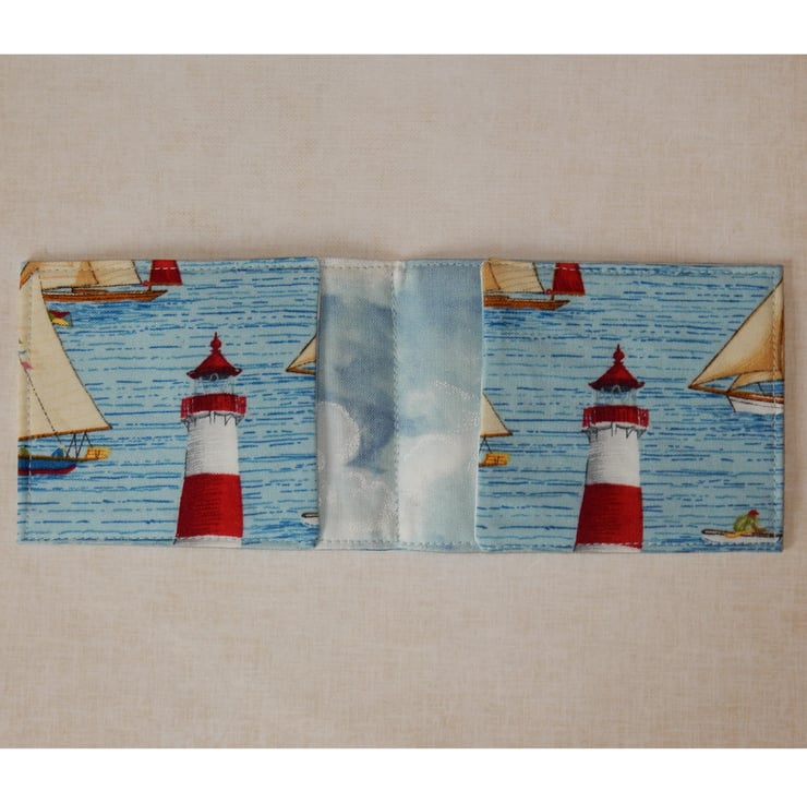 This card wallet would make a great small gift. It features traditional yachts sailing on the sea. I wonder if they are having a race? There are also two lighthouses on the inside. The wallet is ideal for travel cards, Oyster cards, bus pass, train tickets and credit cards. It measures approx. 3.5 x 3 inches folded and 7.5 inches open. It is made from cotton fabric, and lined in a toning cloud print fabric.