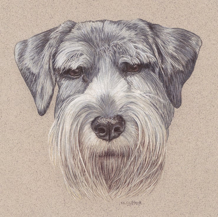 This is a unique original drawing - a portrait of a giant schnauzer dog drawn with coloured pencils. He is looking straight out of the picture, peering under his bushy eyebrows. With his splendid white whiskery beard he looks a little stern, but his silky ears and his shiny black nose are on the alert for anything interesting. His fur is many shades of greys which are shown to advantage on a plain pinky-grey background.