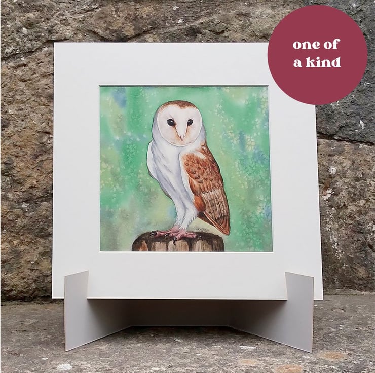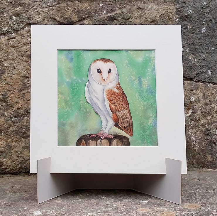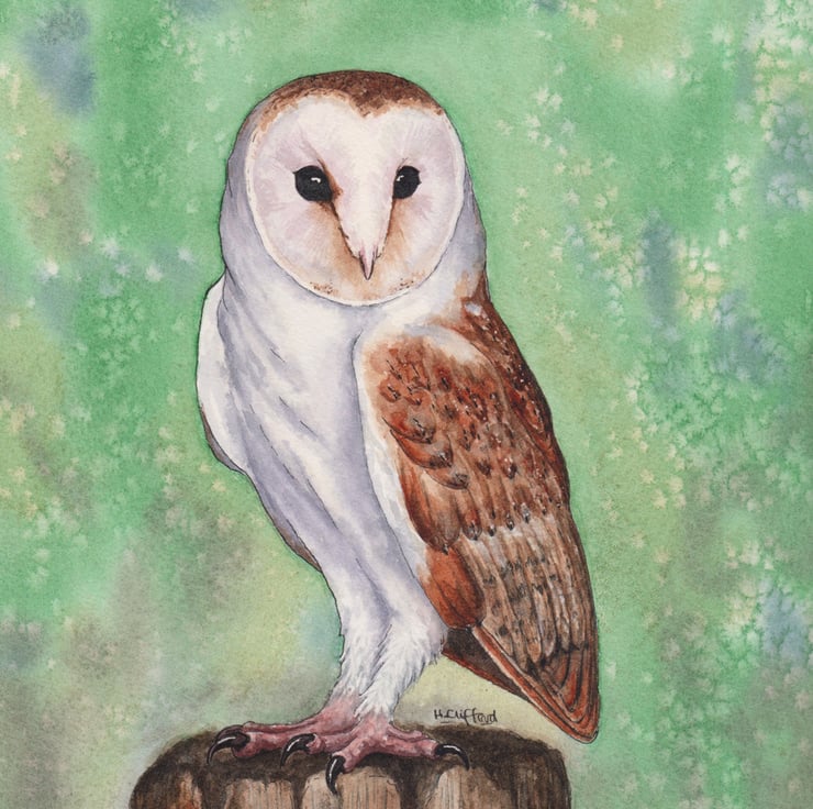 This is a unique original watercolour painting of a barn owl sitting on a wooden post. The bird’s round white face is straight towards the viewer, but he is looking a little to the right as if his incredibly sensitive hearing has picked up some slight sound behind us. His feathers are deep and soft so that he can fly soundlessly on the speckled brown and grey wings which contrast with his clean white chest and underside. Standing on an old wooden post, his sharp claws can clearly be seen. The background is painted loosely in a greeny blue wash which provides a clean contrast with the body