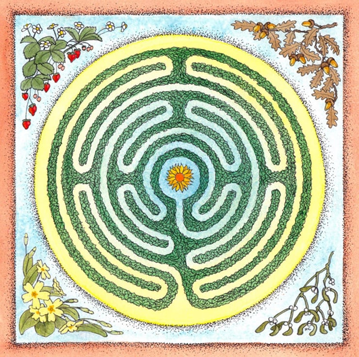 This is a unique original watercolour painting of a labyrinth. The labyrinth is an age-old traditional symbol of journeying and self-discovery used for meditation. This painting was inspired by my experience of walking a labyrinth is a delightful garden, so I have shown the hedges outlining the path. In the four corners are plants associated with the seasons, representing time and change as well as nature: primroses for spring, strawberries for summer, acorns for autumn and mistletoe for winter.