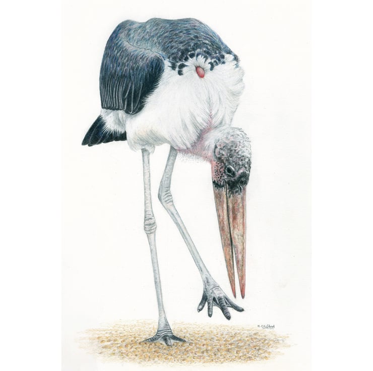 This is a unique original colour pencil drawing of a marabou stork, a large and powerful bird native to Africa with very long legs, a bald head and a thick strong beak. This individual almost appears to be dancing – he is bent down looking at the floor and lifting one foot which has slightly webbed toes. His black and white plumage is very striking and the feathers appear to be deep and soft, a contrast to the pinkish beak which is long, strong and hard. To show him most clearly, no background has been added except an indication of the gravelly ground on which he is standing.