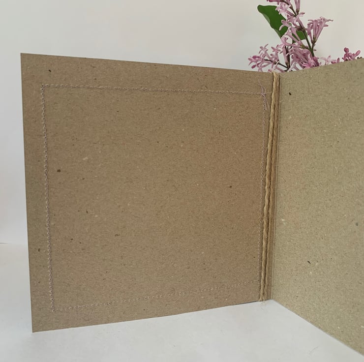 The hessian is machine stitched, using a contrasting thread, onto a plain brown recycled card. This stitching is visible on the inside of the card.