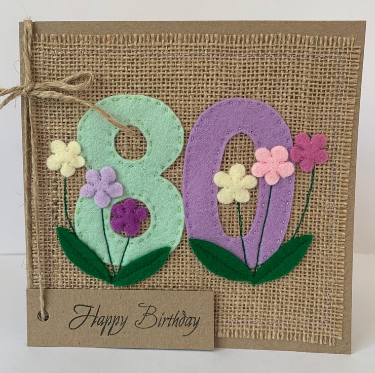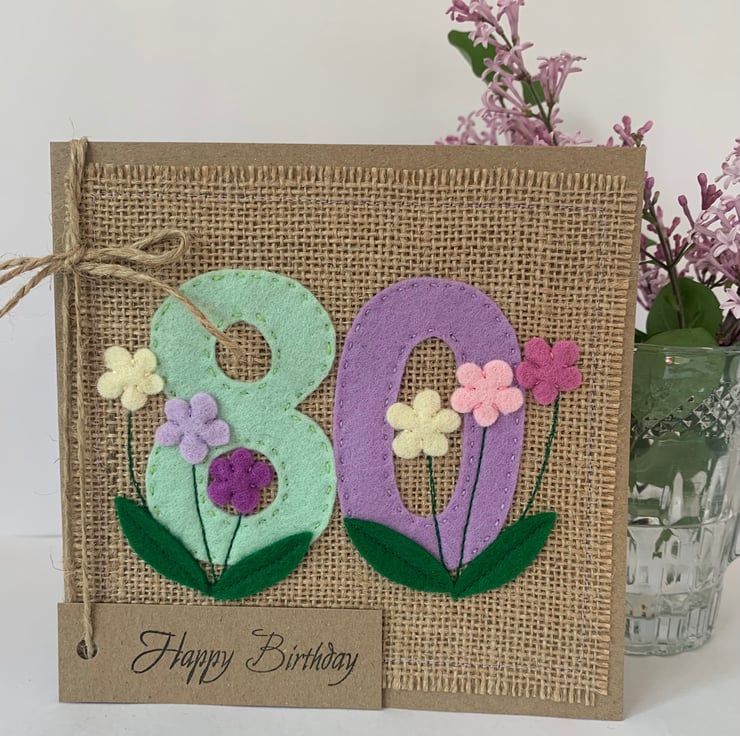 A unique handmade card for a special birthday. The numbers for this 80th birthday card are hand cut from mint green and lilac acrylic felt and hand sewn to a hessian background. Flowers, hand cut from wool felt, in contrasting colours are added to decorate the card.