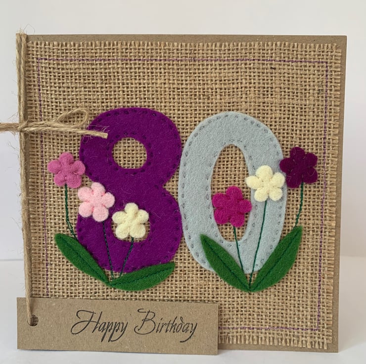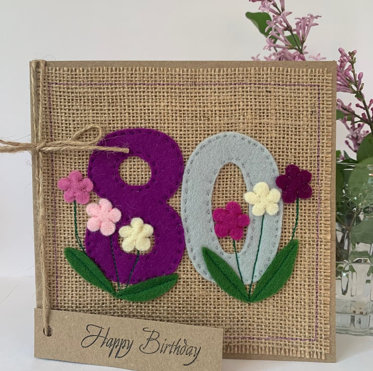A unique handmade card for a special birthday. The numbers for this 80th birthday card are hand cut from cerise and pale grey acrylic felt and hand sewn to a hessian background. Flowers, hand cut from wool felt, in contrasting colours are added to decorate the card.
