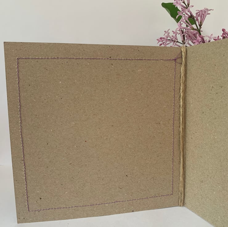 The hessian is machine stitched, using a contrasting thread, onto a plain brown recycled card. This stitching is visible on the inside of the card.