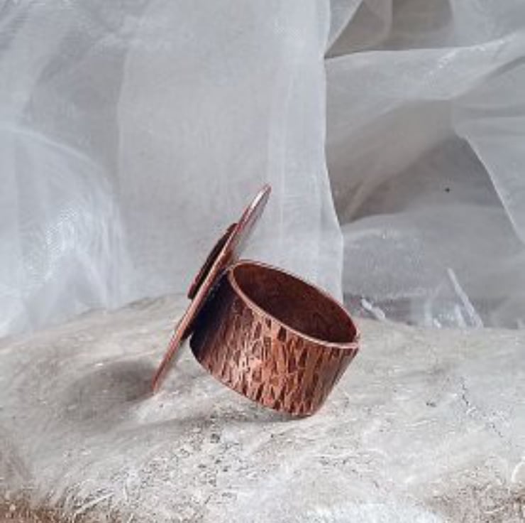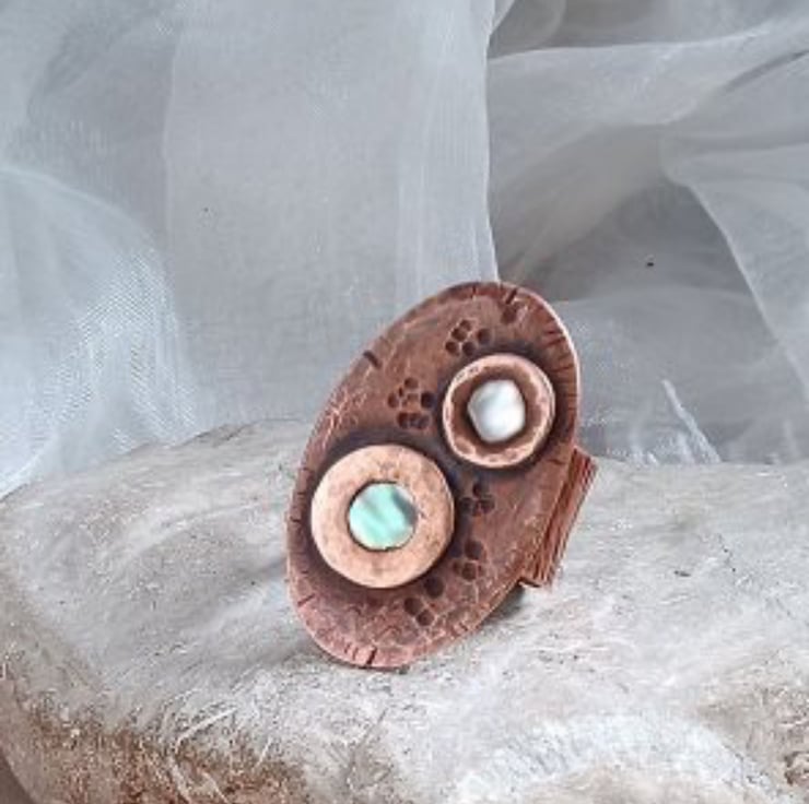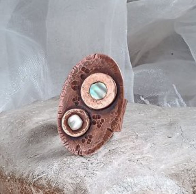 Inspired by daisies growing on a patch of grass. A hand cut copper oval with textured copper washers holding circles of iridescent mother of pearl mounted on a wide textured copper band. Oxidised to give a rich patina sealed with silicone wax polish