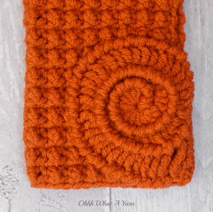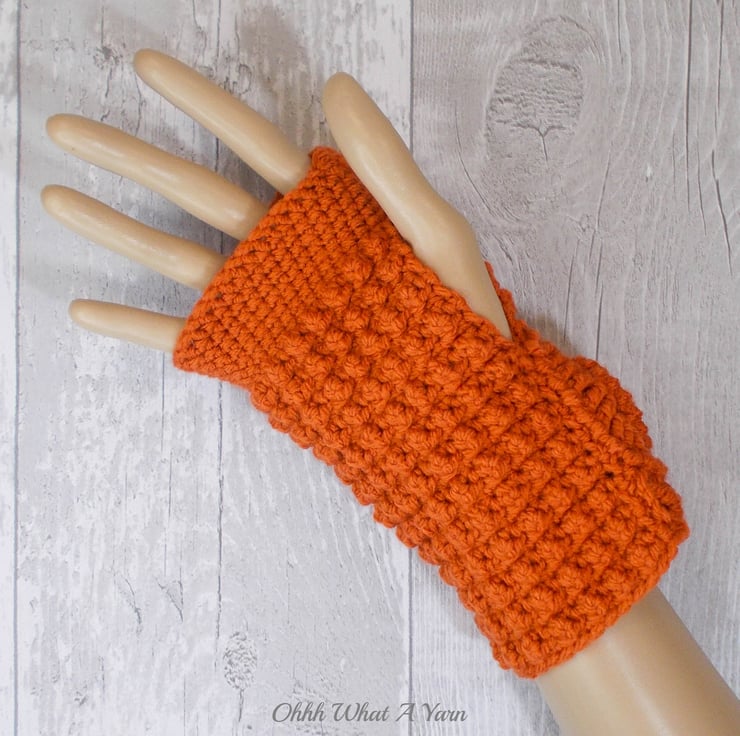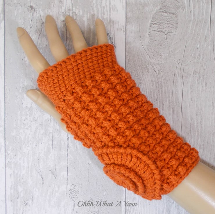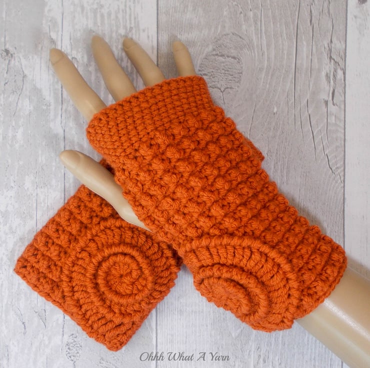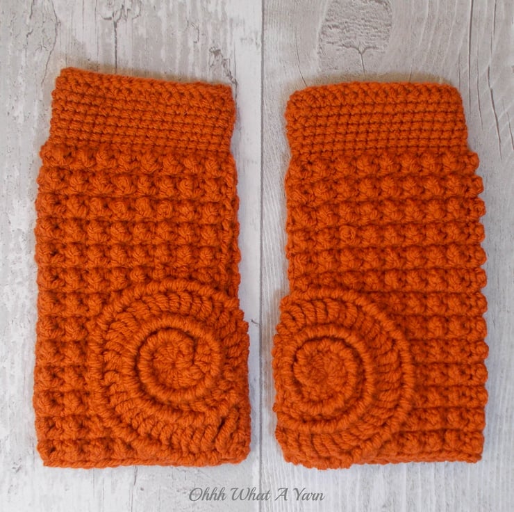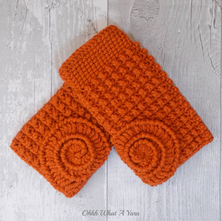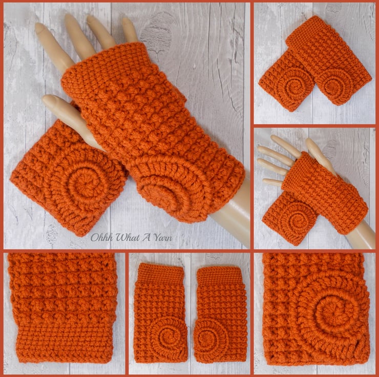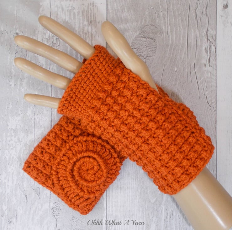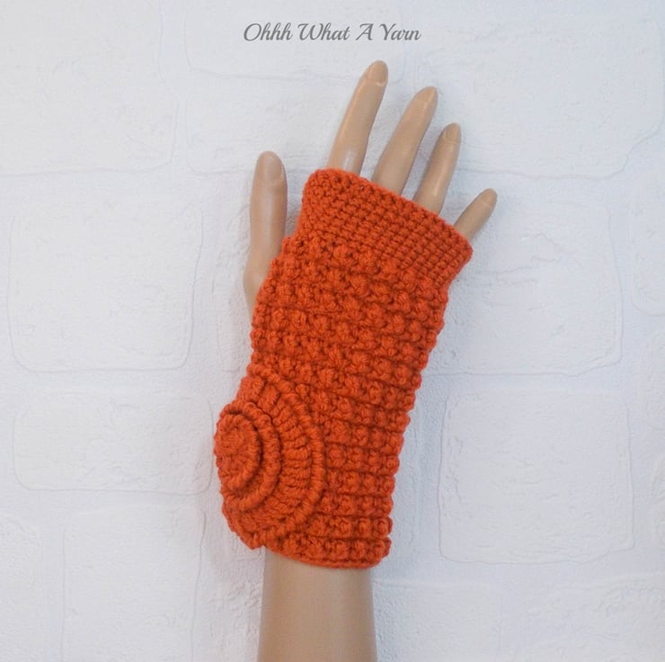 These gorgeous ammonite fingerless gloves have been crocheted using 100% acrylic yarns in a beautiful rust/burnt orange colour.