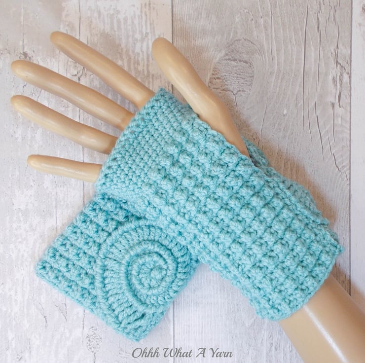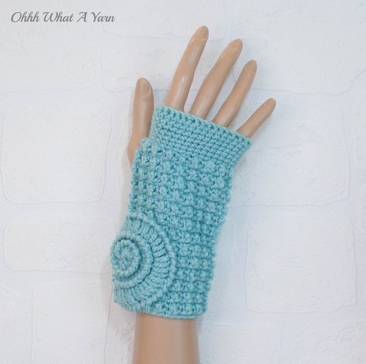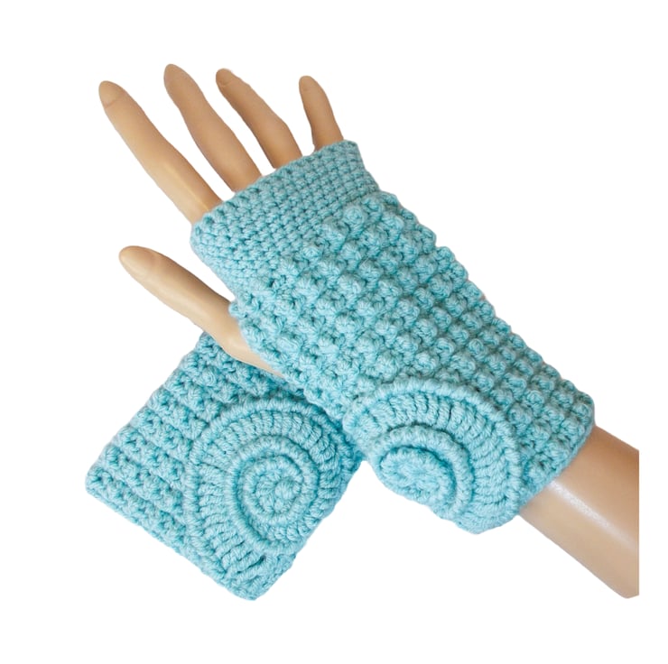 These gorgeous ammonite fingerless gloves have been crocheted using 100% acrylic yarns in a beautiful duck egg blue colour.