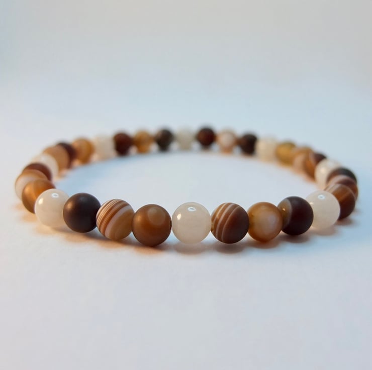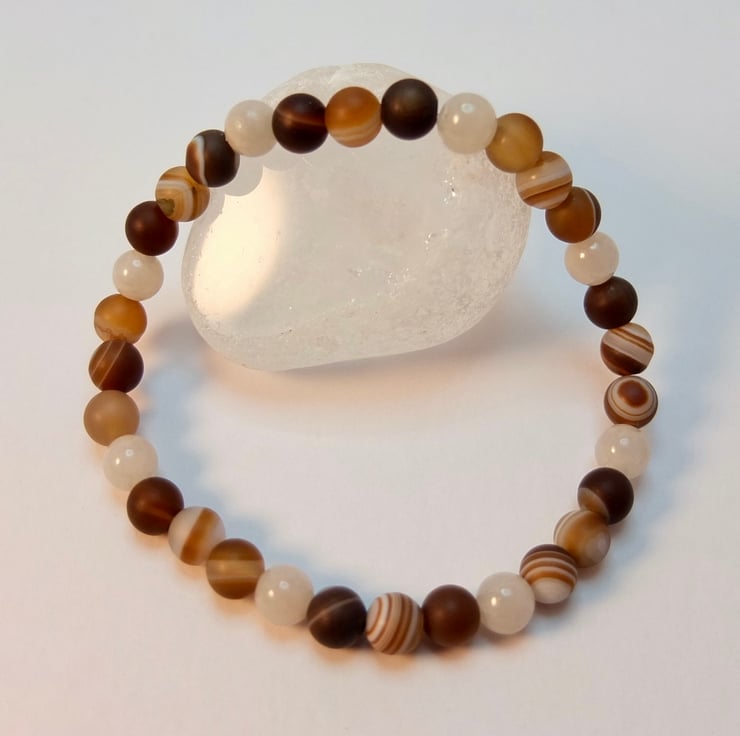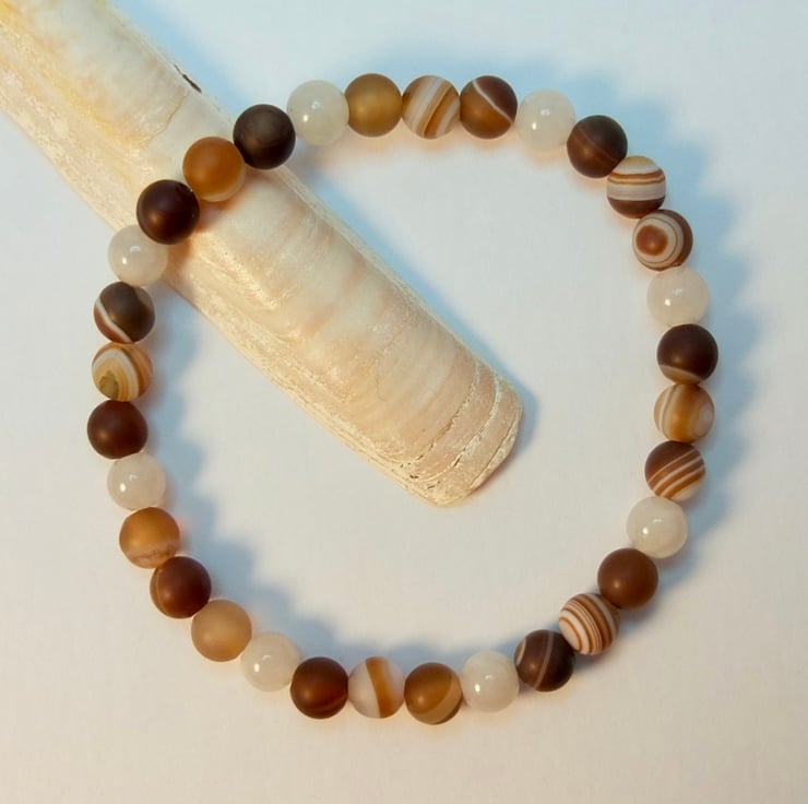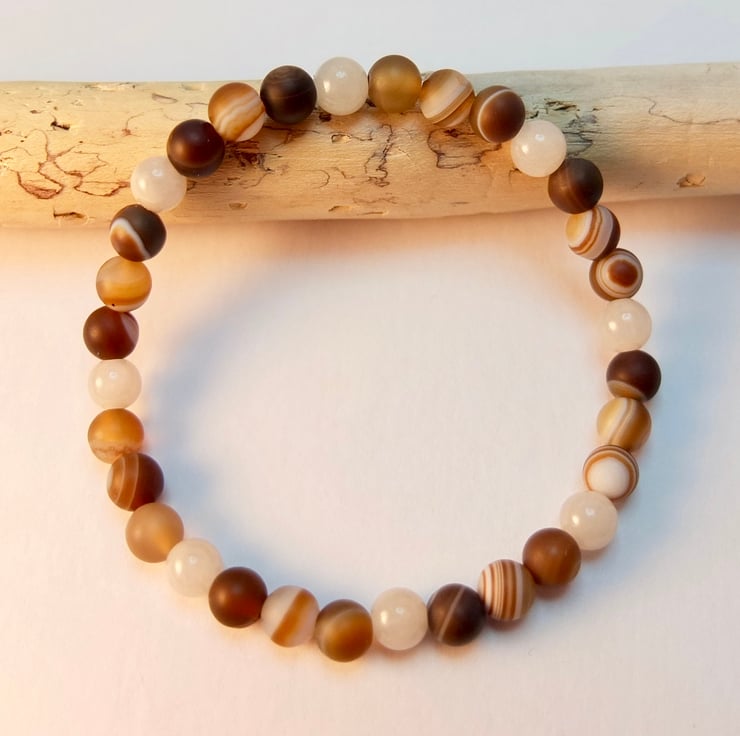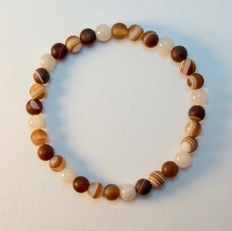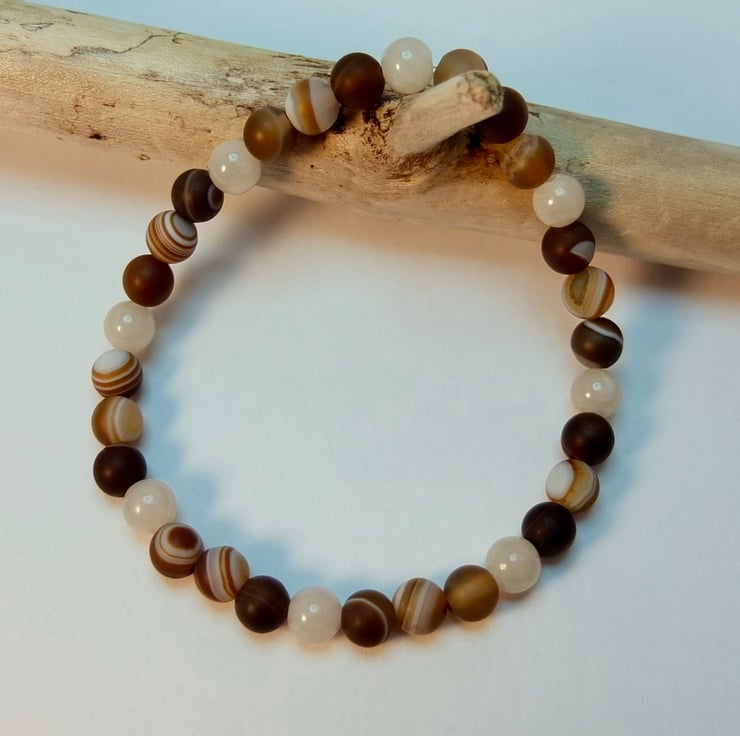 Striking bracelet made from 6mm, frosted, Banded Agate, in dark-to-light browns with cream and white stripes, and 6mm light grey Jade beads.