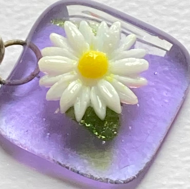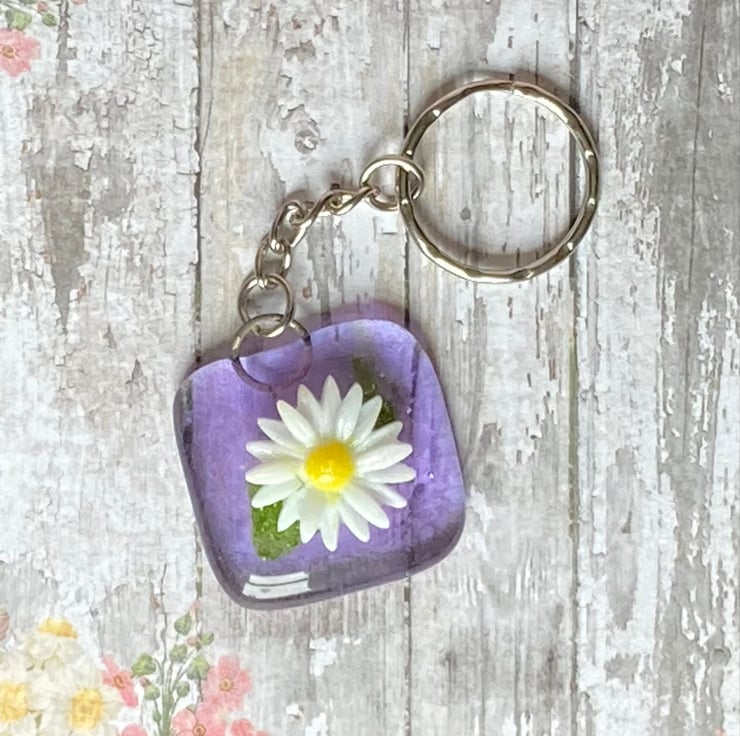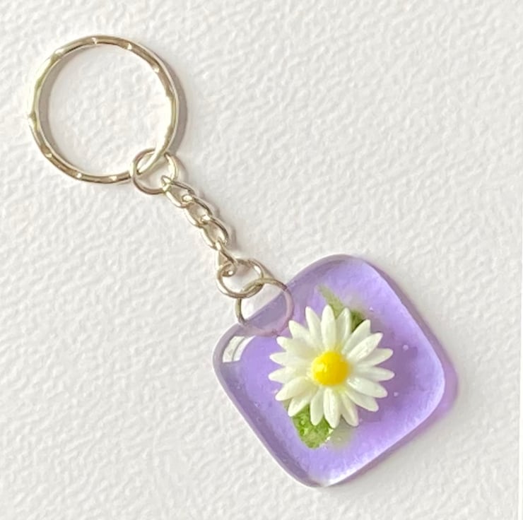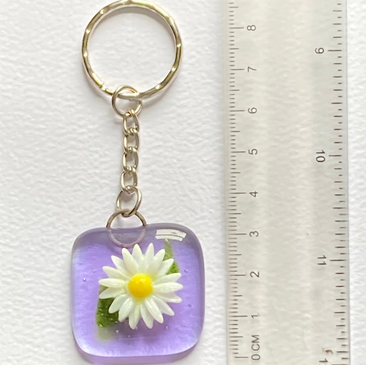 A fused glass Keyring with a pretty glass daisy. The lavender background measures approximately 3cm x 3cm and the full length is approximately 9cm. Postage is included in the price.