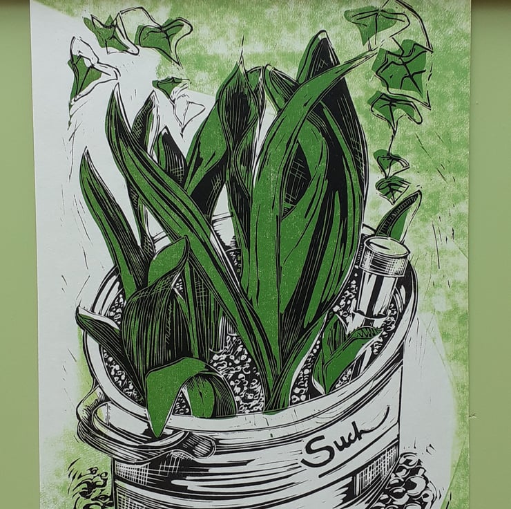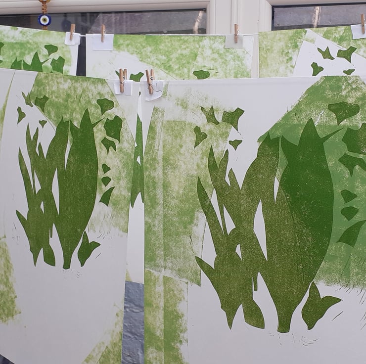 With sketches made and text and final layout decided upon, I transferred my design onto a traditional hessian backed lino which I then hand cut. Once dry, the irregular base ‘sweeps’ of light green were over printed, first with a dark green to emphasise the leaves and then the main image details in black.