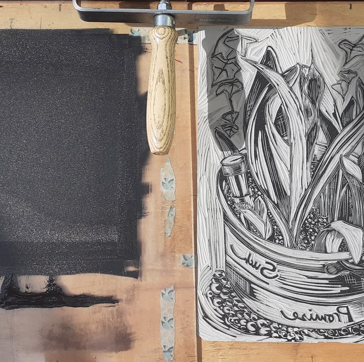 With sketches made and text and final layout decided upon, I transferred my design onto a traditional hessian backed lino which I then hand cut. Once dry, the irregular base ‘sweeps’ of light green were over printed, first with a dark green to emphasise the leaves and then the main image details in black.