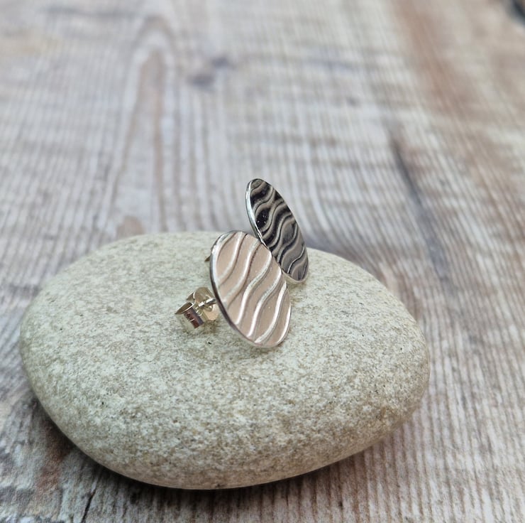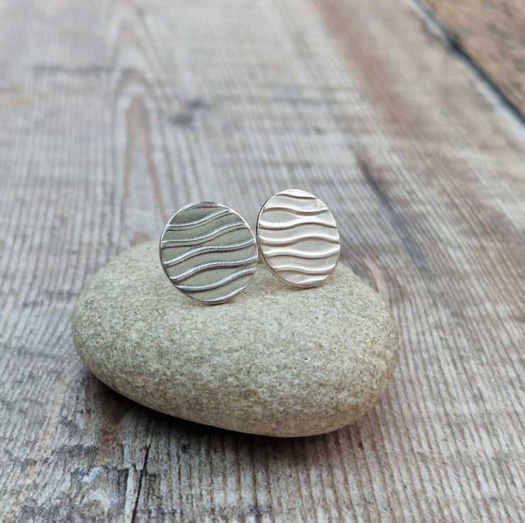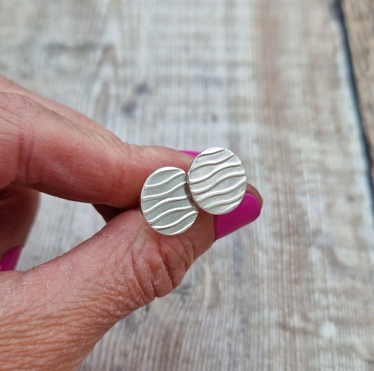 These stylish wavy disc stud earrings are made from recycled sterling silver, featuring a subtle wave pattern that adds texture and dimension to their surface. The elegant design captures the light beautifully, giving these studs a refined and contemporary look.