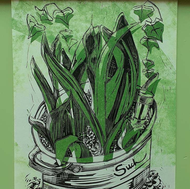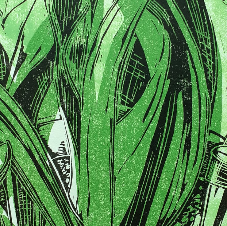 With sketches made and text and final layout decided upon, I transferred my design onto a traditional hessian backed lino which I then hand cut. Once dry, the irregular base ‘sweeps’ of light green were over printed, first with a dark green to emphasise the leaves and then the main image details in black.