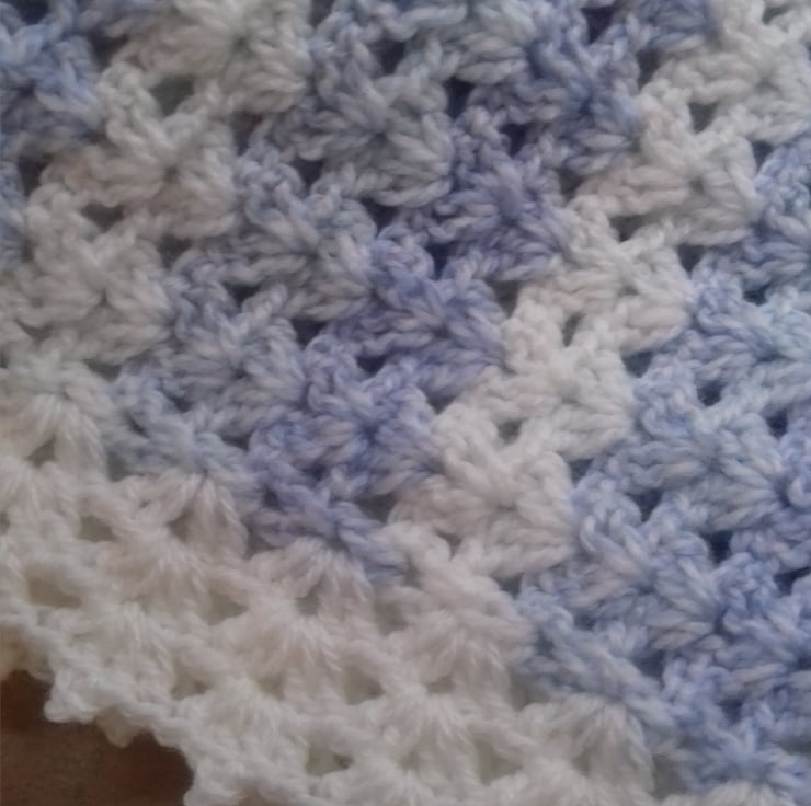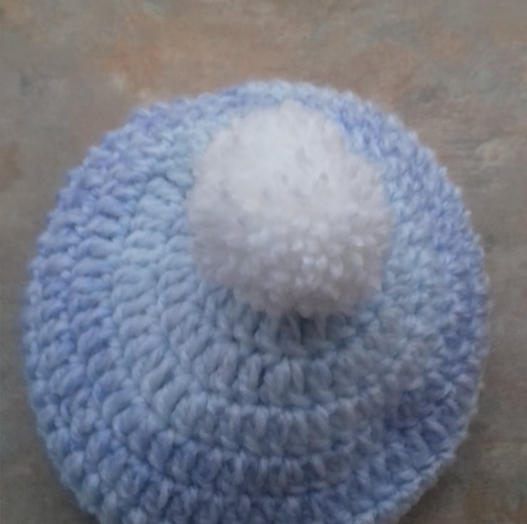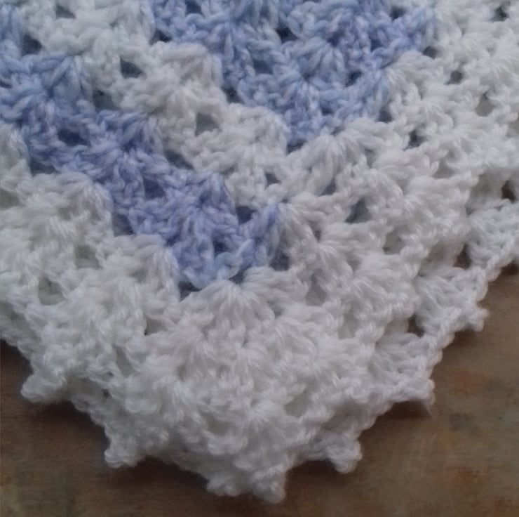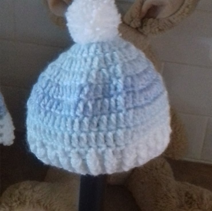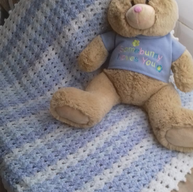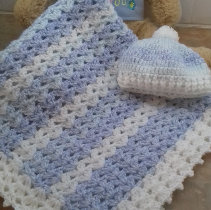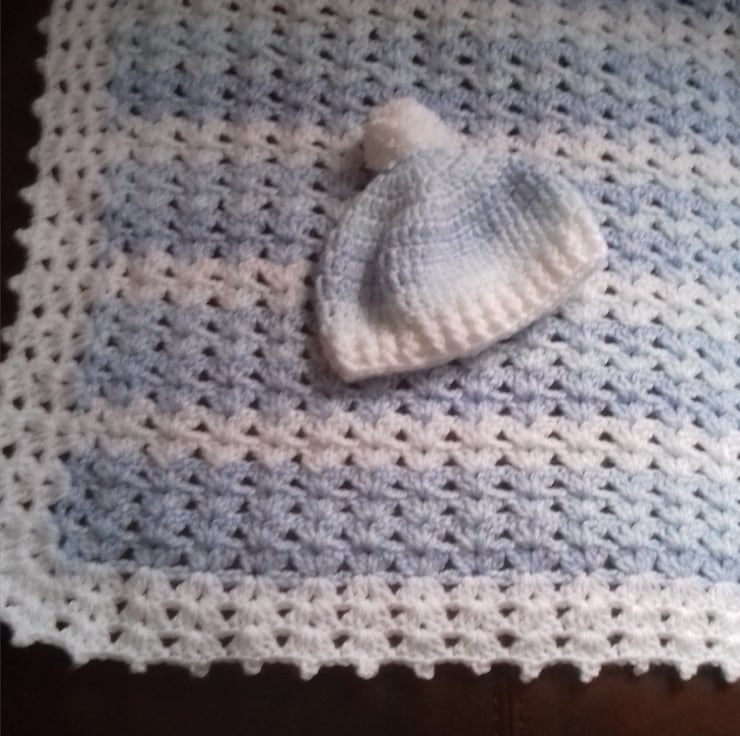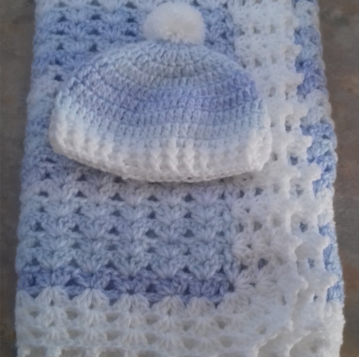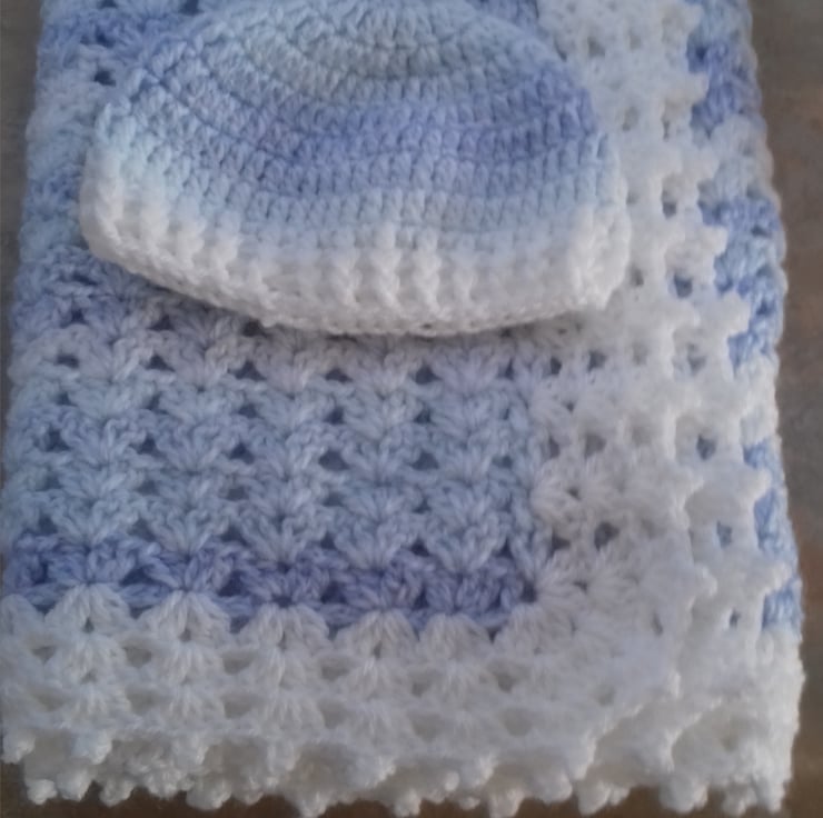 New born baby boy crochet blanket and hat gift set .The wool used is a soft baby double knit wool in different shades of blue and whites that blend in together.I have edged the blanket in a white wool with a decorative crocheted edge .
