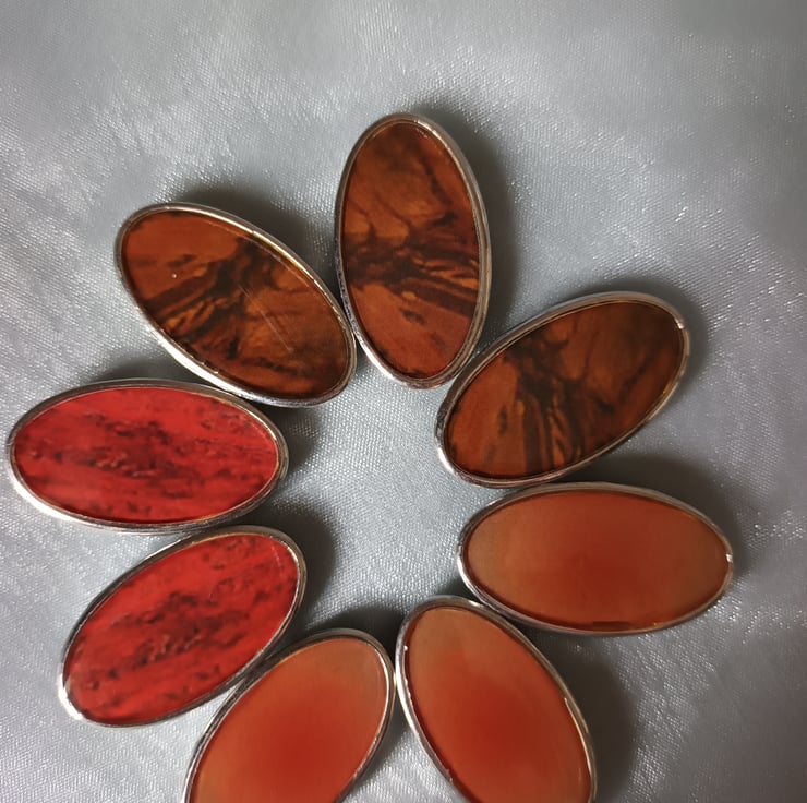 Eye catching set of 9 flat oval shaped lozenge shaped beads. In Autumnal shades with silver metal backs they would be a great addition to any piece. They have 4 eyelets on the back for threading. Each lozenge measures 3.5cm x 1.75cm. There are some small marks not scratches on 2 of them but hardly noticeable.