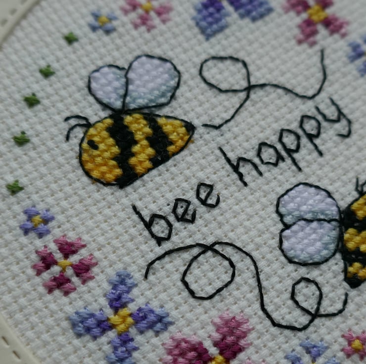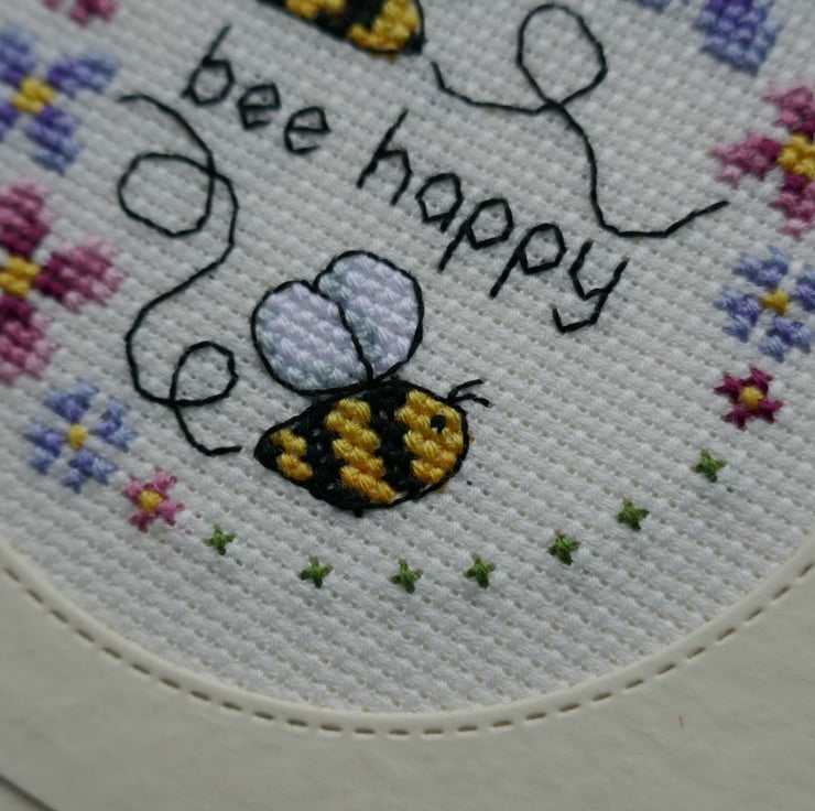 The cross stitch bees and flowers are from a design by Catkin and Lillie. The bees are stitched in yellow and black with blue and white wings. The flowers are in shades of pink and purple with yellow centres. The garland is finished with small green crosses. The cross stitch has been mounted behind a cream hammer frame that has been cut with a stitched circle die before being attached to the centre of the card.